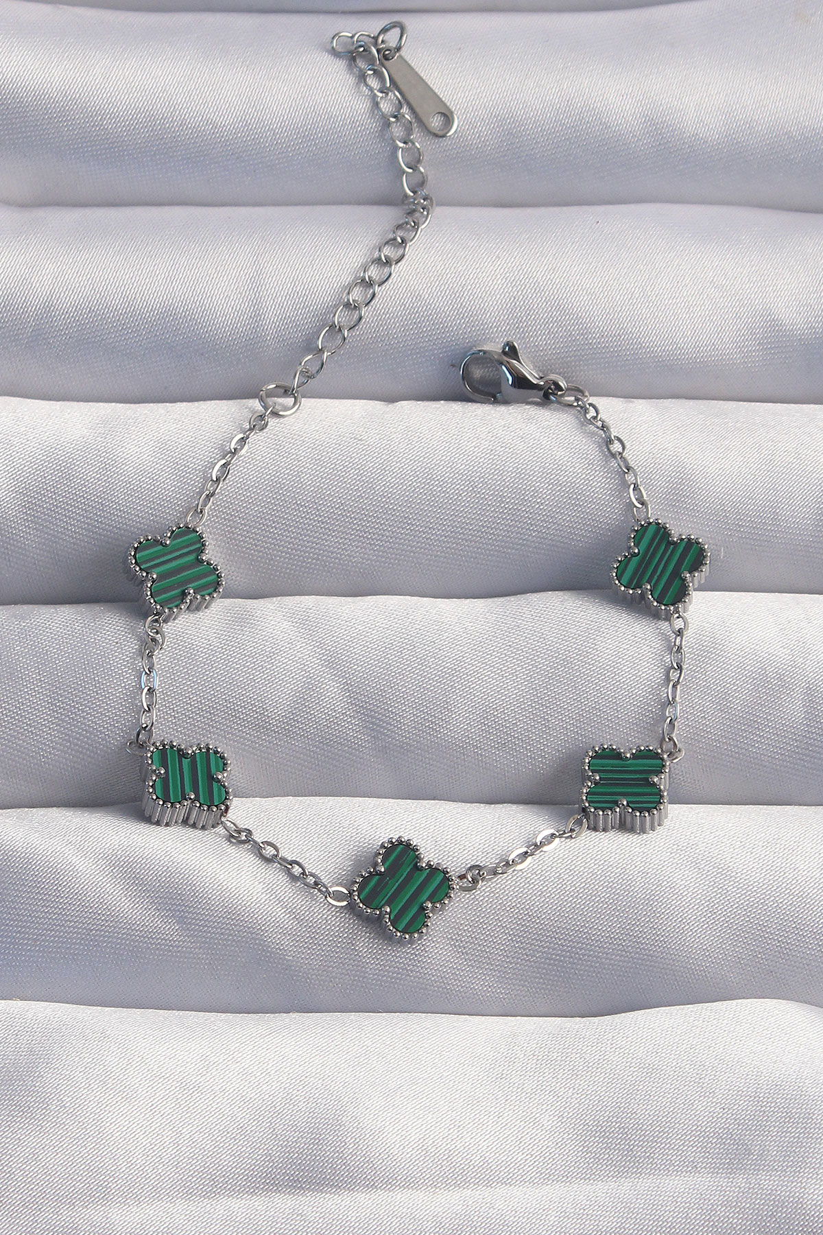 Tegan 316L Çelik Baby Boy Gümüş Renk Çizgili Yeşil Mineli Yonca Bileklik TG27BB6270