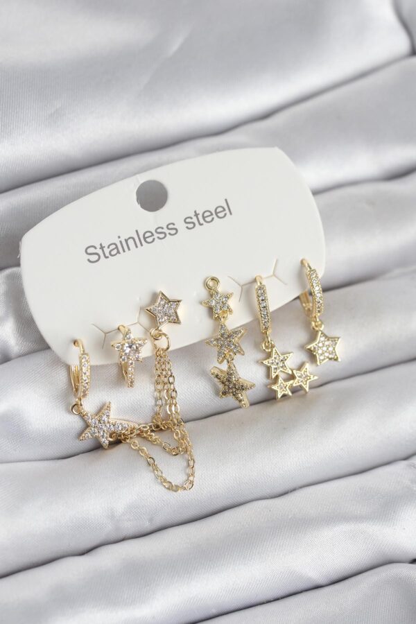 Tegan 316L Çelik Gold Renk 6’lı Set Zincirli Yıldız Modelli Kadın Küpe TG27BKP11748