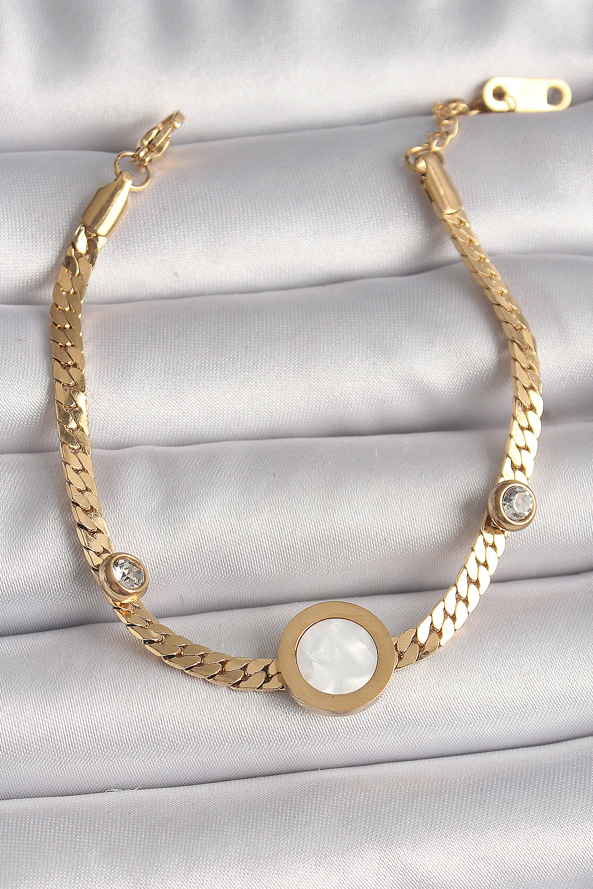 Tegan 316L Çelik Gold Renk Yassı Zincir Model Zirkon Taş Detaylı Beyaz Mineli Madalyon Model Kadın Bileklik TG27BB6732