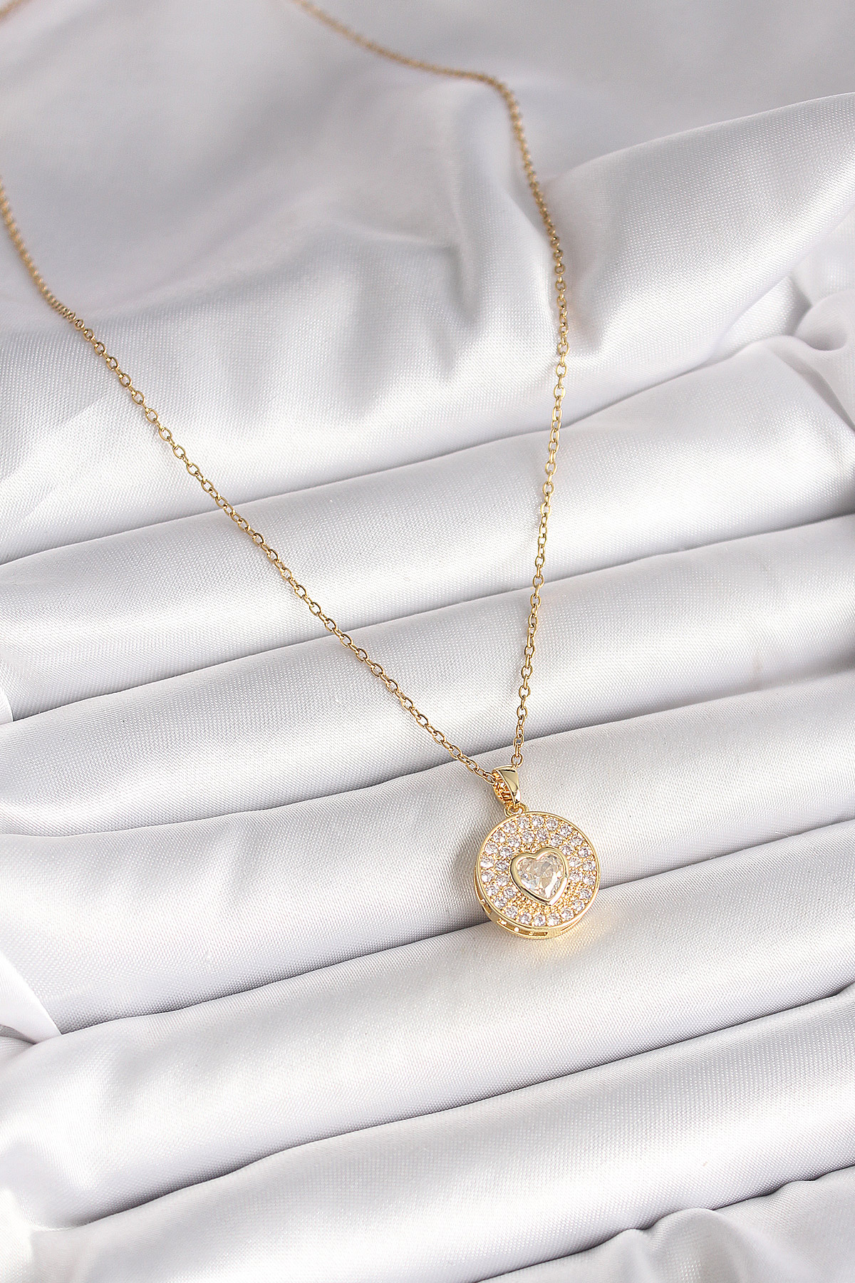Tegan 316L Çelik Gold Renk Zincir Madalyon Zirkon Taşlı Kalp Model Kadın Kolye TG27BKO9946