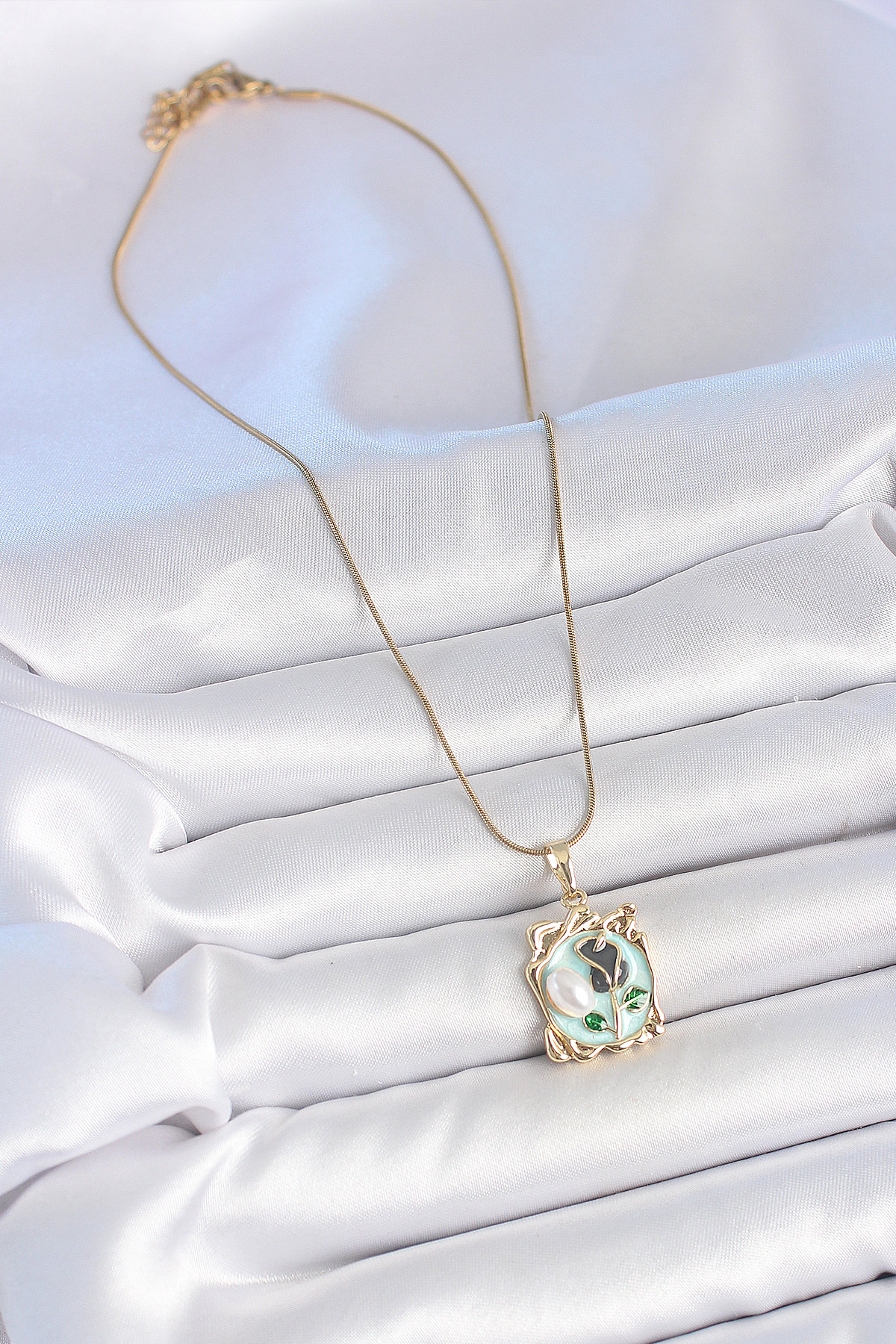 Tegan 316L Çelik Gold Renk Zincir Mavi Mineli Çiçek İşlemeli İnci Detay Portre Model Kadın Kolye TG27BKO10186