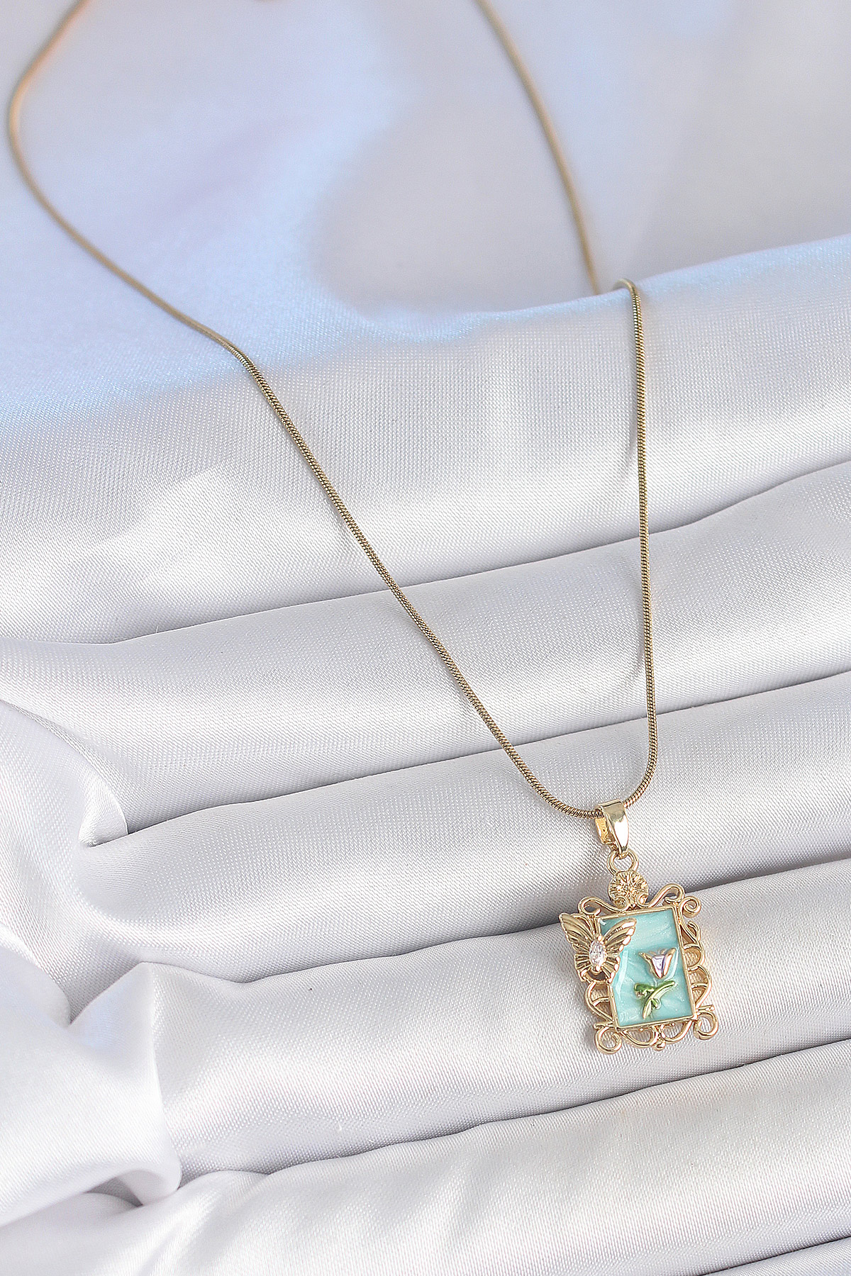 Tegan 316L Çelik Gold Renk Zincir Mavi Mineli Çiçek İşlemeli Zirkon Taşlı Kelebek Detay Portre Model Kadın Kolye TG27BKO10189