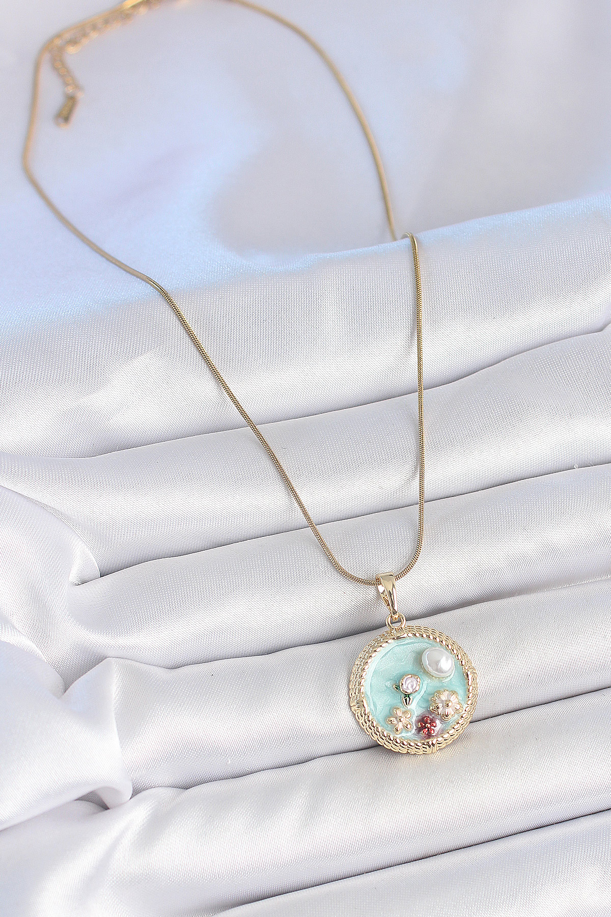 Tegan 316L Çelik Gold Renk Zincir Mavi Mineli İnci Çiçek İşlemeli Zirkon Taş Detaylı Madalyon Model Kadın Kolye TG27BKO10174