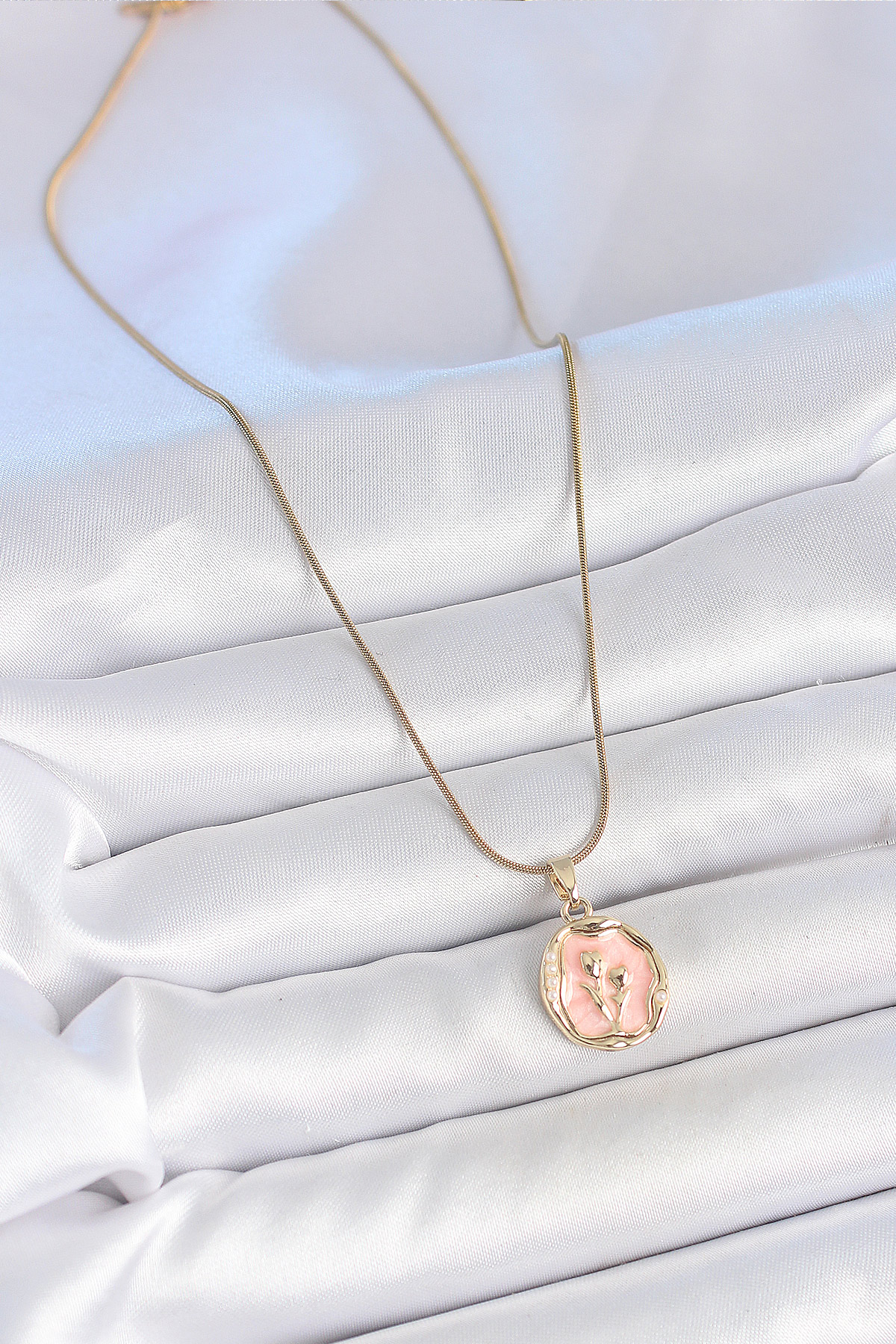 Tegan 316L Çelik Gold Renk Zincir Pembe Mineli Çiçek İşlemeli Portre Model Kadın Kolye TG27BKO10165