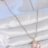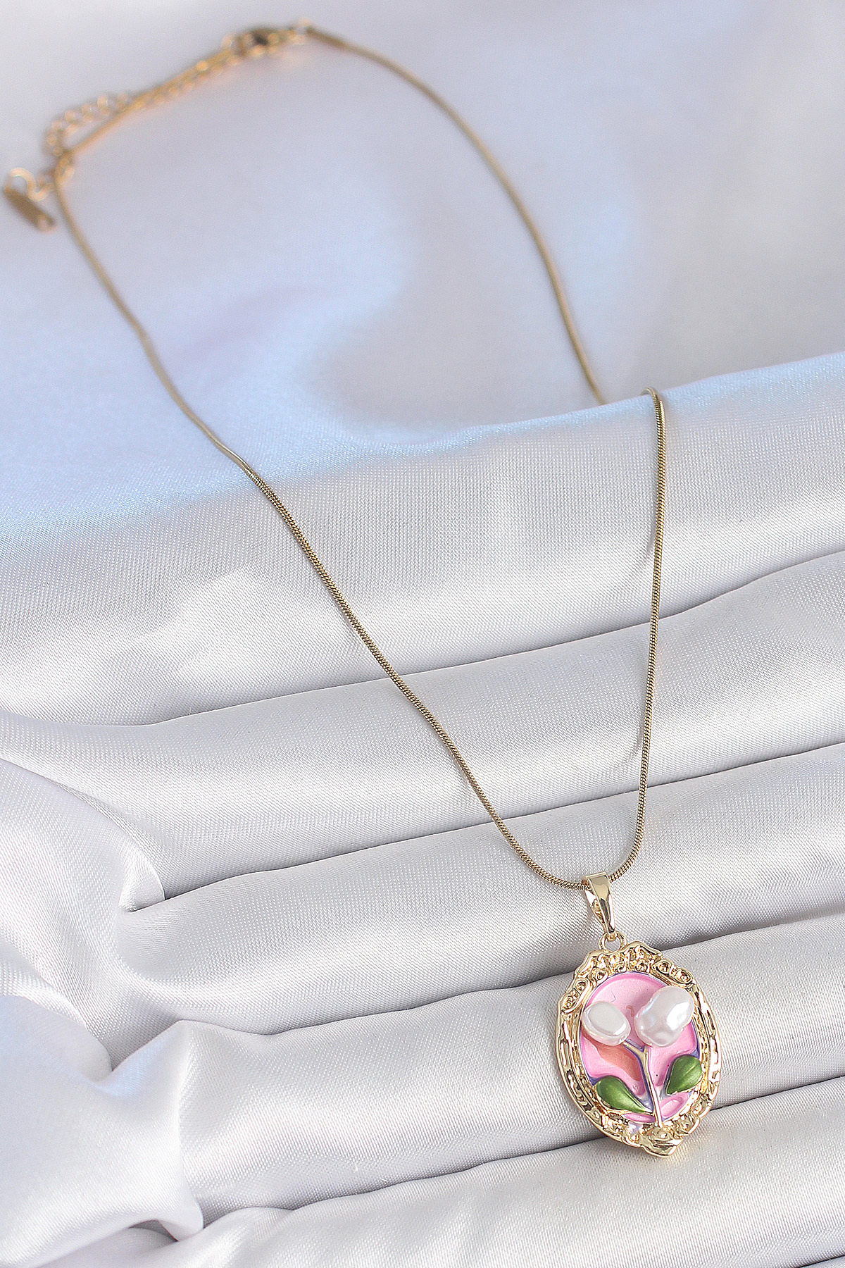 Tegan 316L Çelik Gold Renk Zincir Pembe Mineli İncili Çiçek İşlemeli Portre Model Kadın Kolye TG27BKO10169