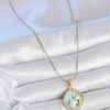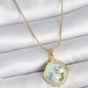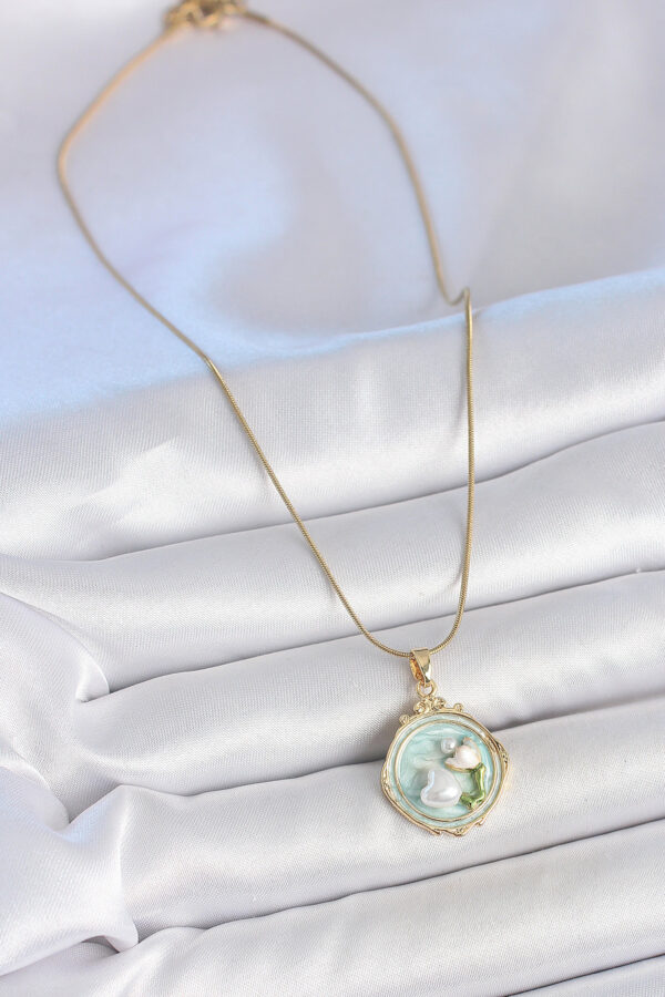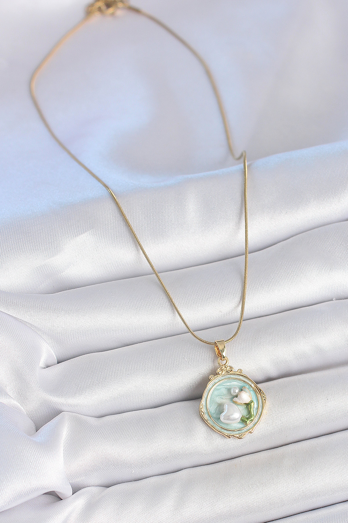Tegan 316L Çelik Gold Renk Zincir Turkuaz Mineli İncili Çiçek İşlemeli Portre Model Kadın Kolye TG27BKO10157