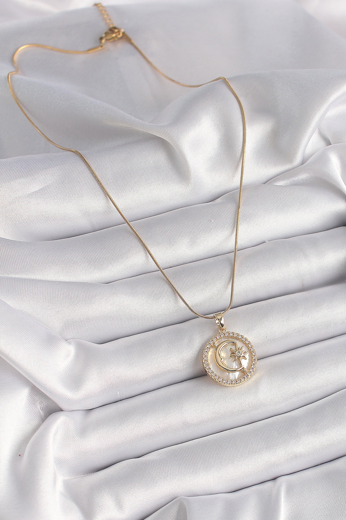 Tegan 316L Çelik Gold Renk Zincir Zirkon Taş Detaylı Beyaz Sedefli Ay Yıldız Model Kadın Kolye TG27BKO9638