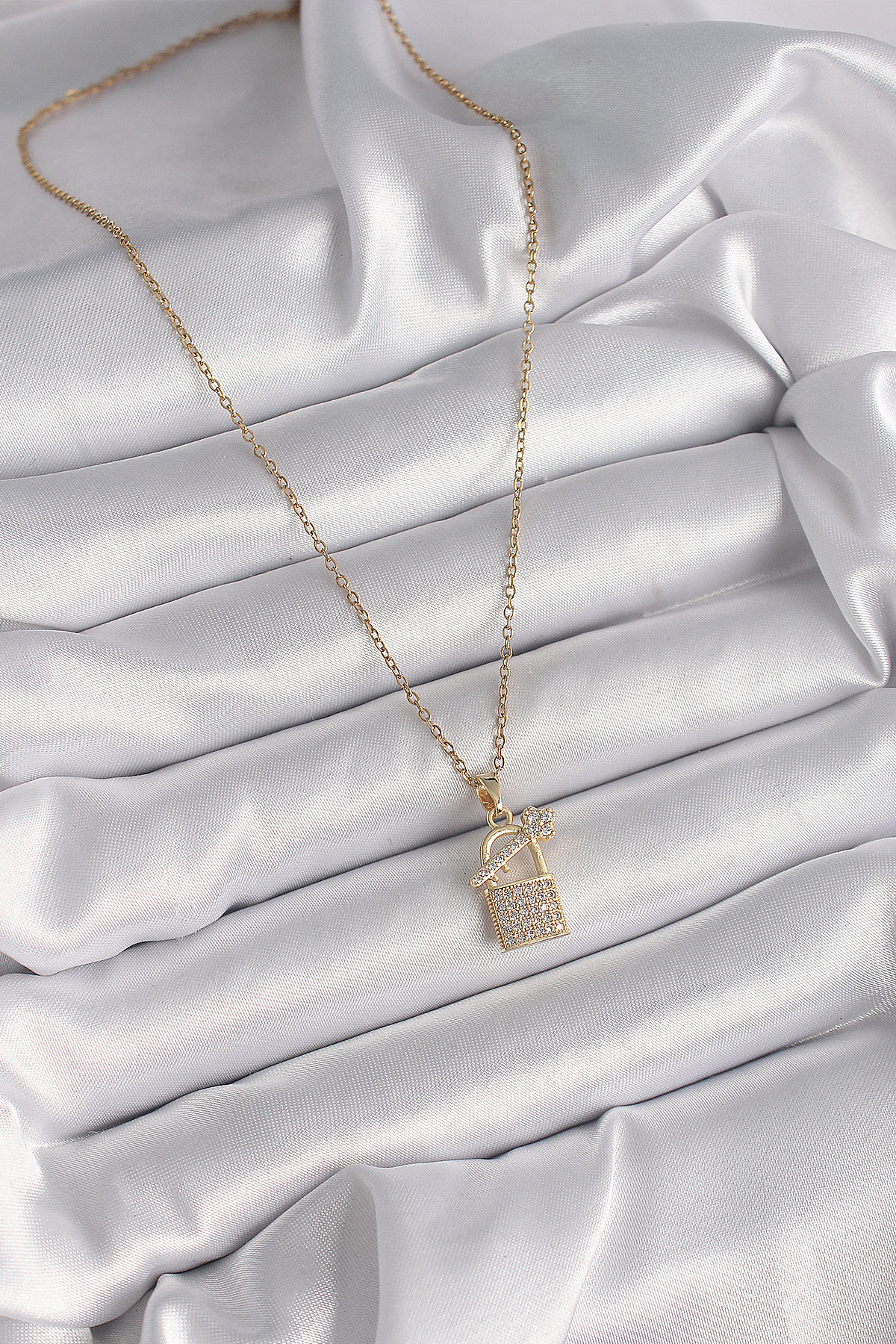 Tegan 316L Çelik Gold Renk Zincir Zirkon Taşlı Asma Kilit Anahtar Model Kadın Kolye TG27BKO9585