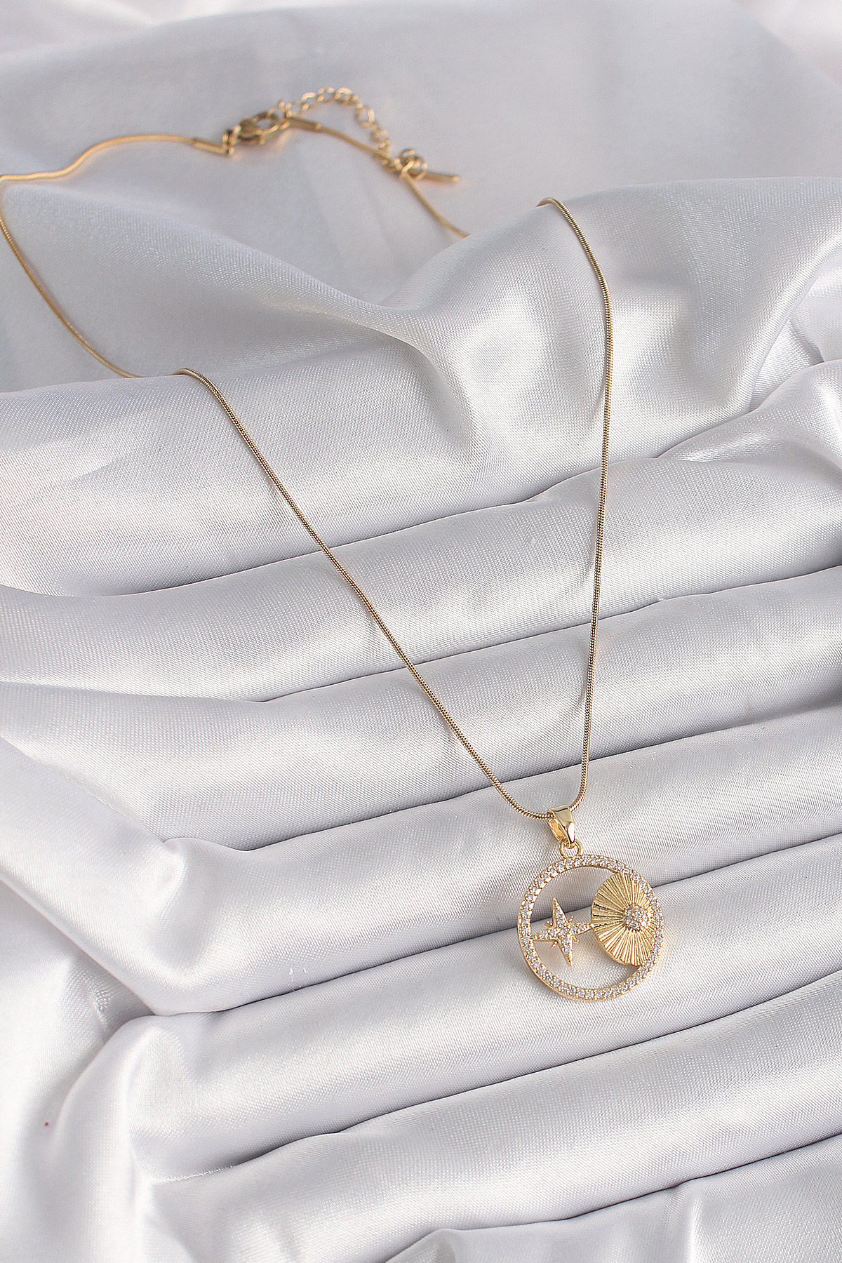 Tegan 316L Çelik Gold Renk Zincir Zirkon Taşlı Yıldız İşleme Madalyon Model Kadın Kolye TG27BKO9636