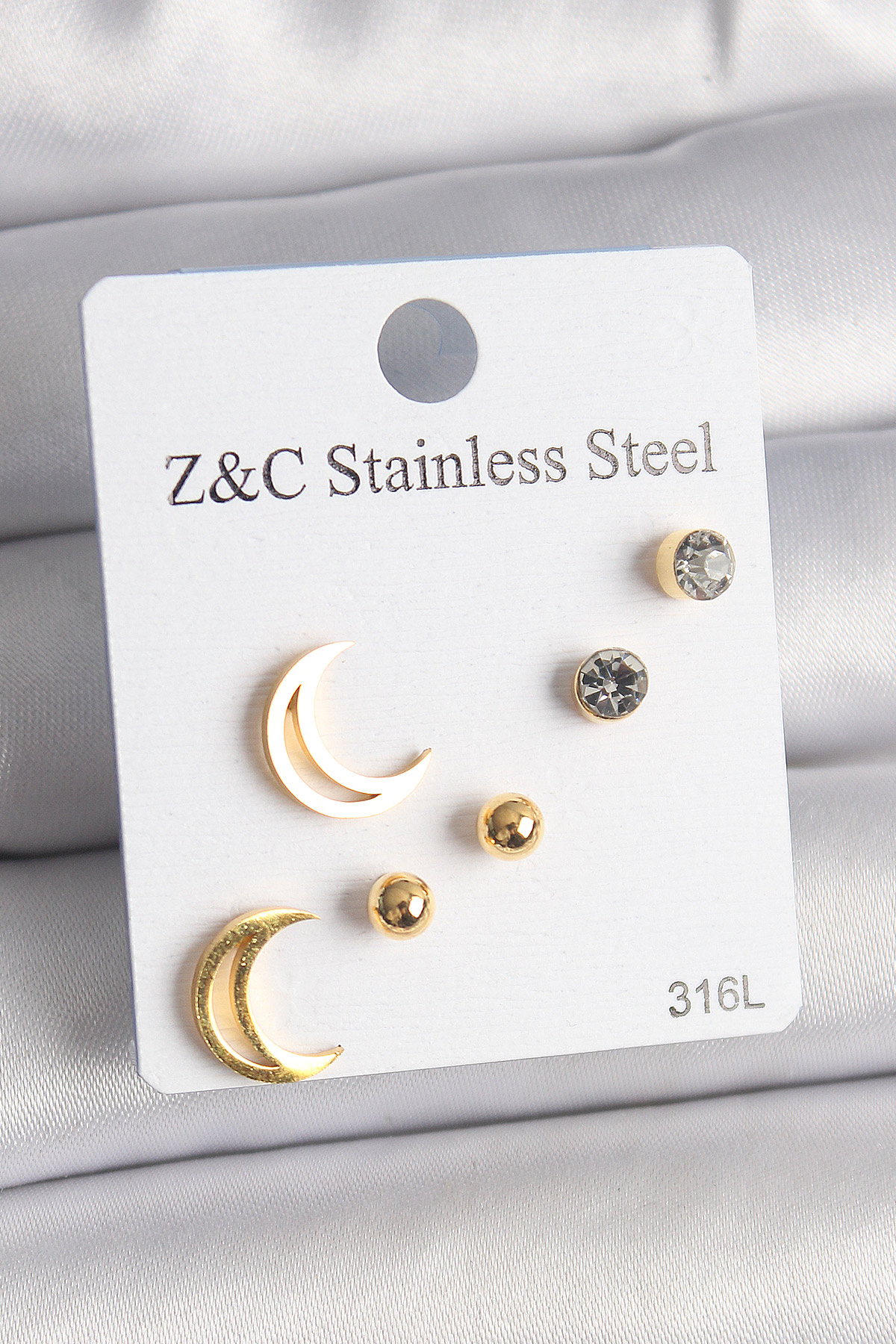Tegan 316L Çelik Gold Renk Zirkon Taşlı Hilal Model Kadın Küpe Seti TG27BKP10009