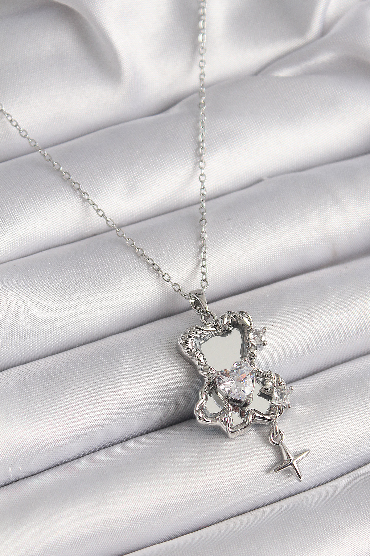 Tegan 316L Çelik Gümüş Renk Ayna Ayıcık Model Zirkon Taşlı Kalp Detay Kadın Kolye TG27BKO9627