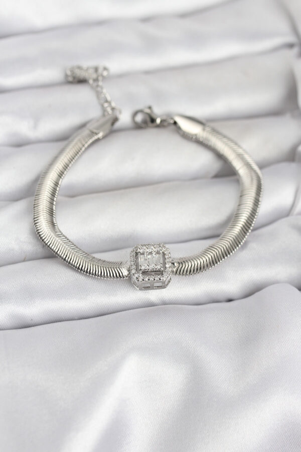 Tegan 316L Çelik Gümüş Renk Baget Zirkon Taşlı Yılan Zincirli Kadın Bileklik TG27BB8155