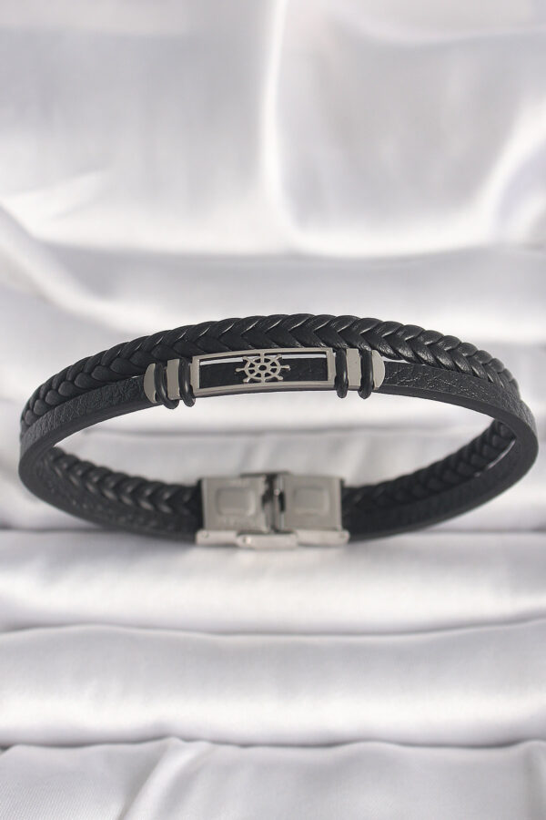 Tegan 316L Çelik Gümüş Renk Gemi Dümeni Figür Siyah Burgu Deri Kordon Model Erkek Bileklik TG27EB3701