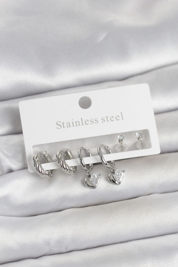 Tegan 316L Çelik Gümüş Renk Kalp Detaylı Kadın Küpe Seti TG27BKP11692