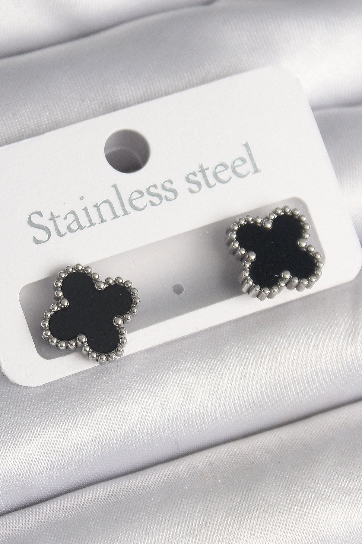 Tegan 316L Çelik Gümüş Renk Siyah Yonca Model Kadın Küpe TG27BKP10201