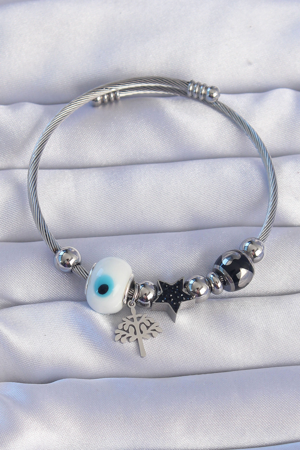 Tegan 316L Çelik Gümüş Renk Siyah Zirkon Taşlı Yıldız Tasarımlı Ağaç Detay Nazarlı Charm Bileklik TG27BB6198