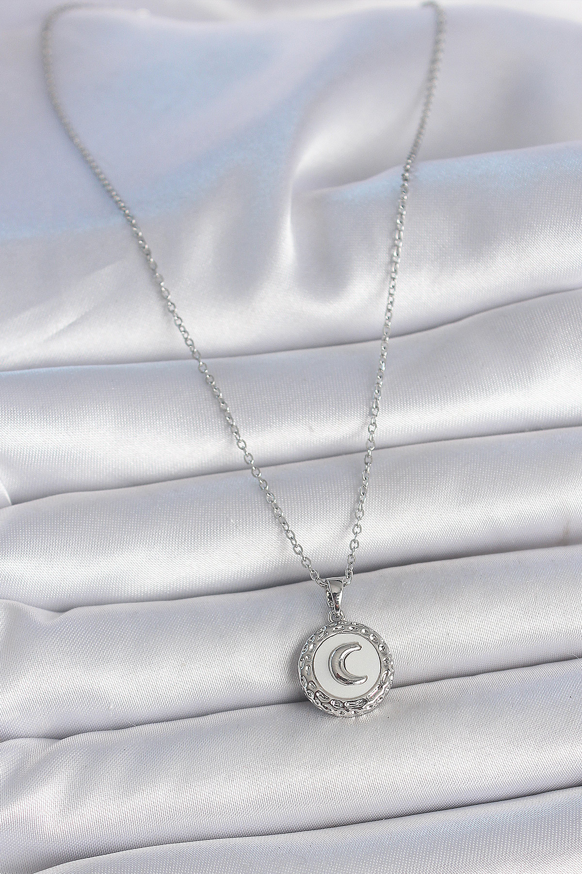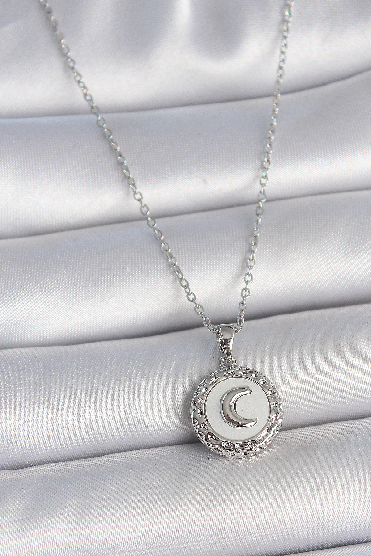 Tegan 316L Çelik Gümüş Renk Zincir Beyaz Mineli Hilal İşlemeli Madalyon Model Kadın Kolye TG27BKO10034