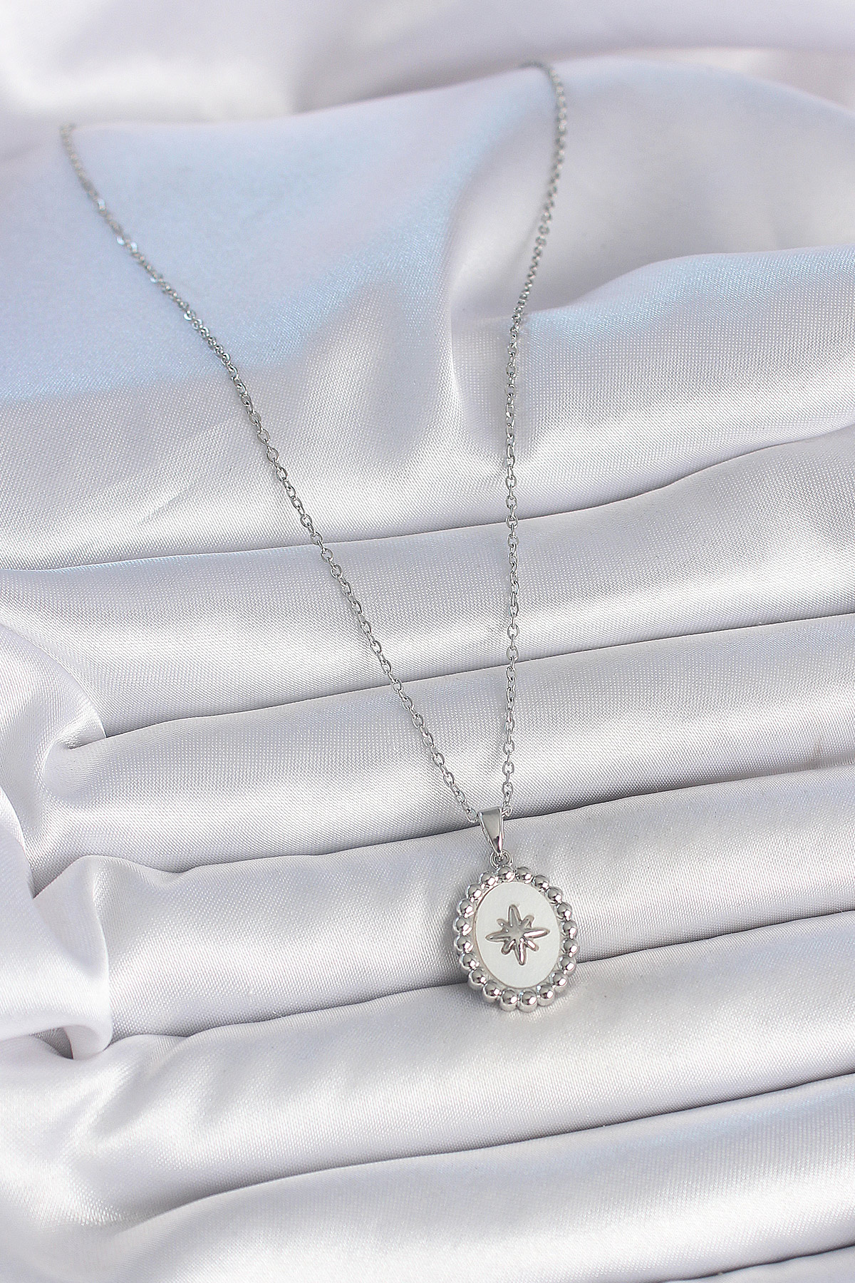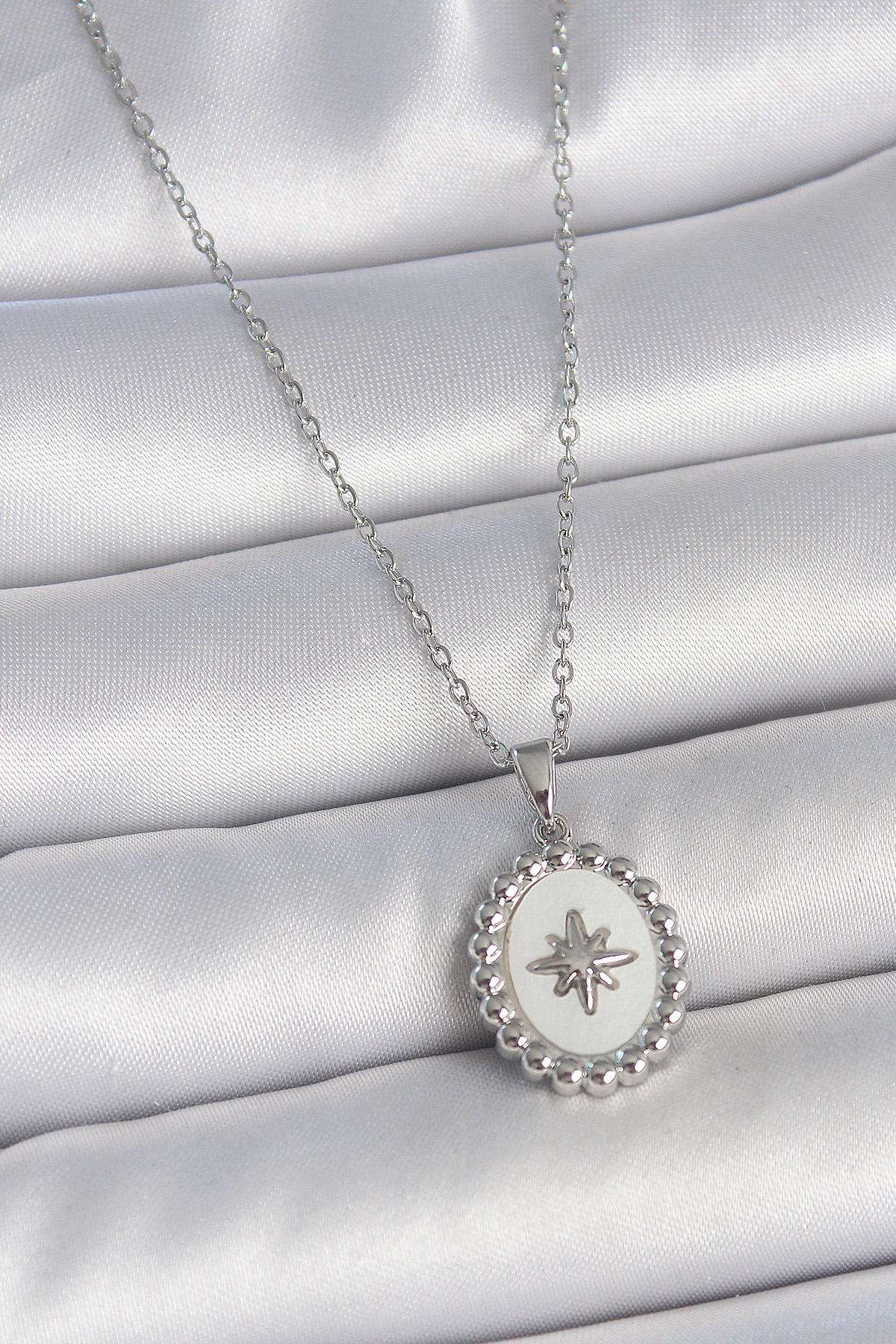 Tegan 316L Çelik Gümüş Renk Zincir Beyaz Mineli Kutup Yıldız İşlemeli Madalyon Model Kadın Kolye TG27BKO10062