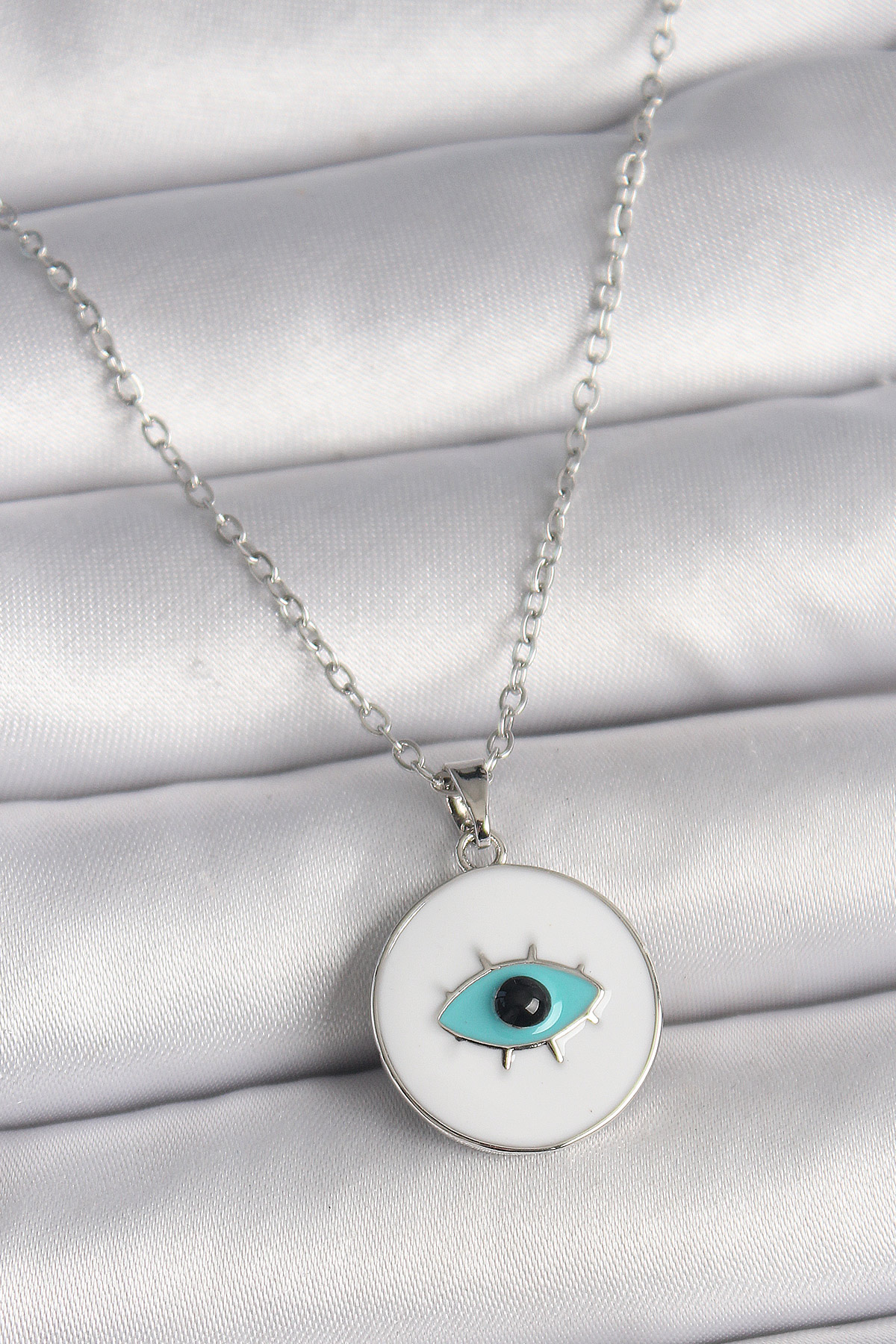 Tegan 316L Çelik Gümüş Renk Zincir Beyaz Mineli Turkuaz Göz İşleme Model Kadın Kolye TG27BKO9729