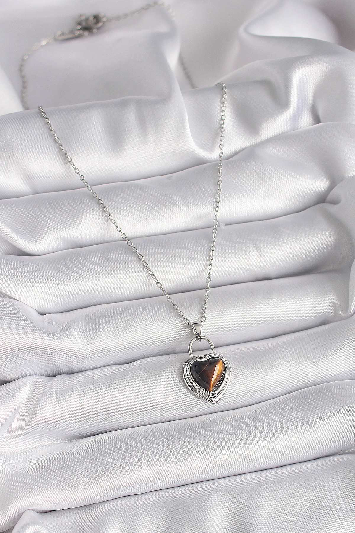 Tegan 316L Çelik Gümüş Renk Zincir Kilit Kalp Kehribar Boncuk Model Kadın Kolye TG27BKO9495