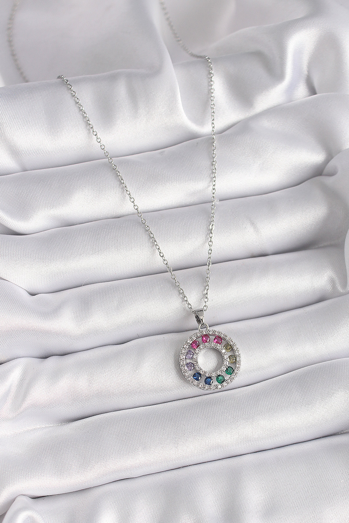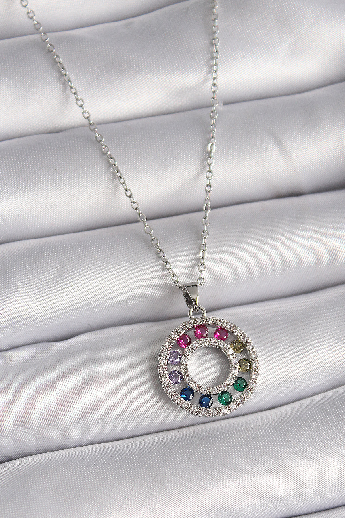 Tegan 316L Çelik Gümüş Renk Zincir Renkli Zirkon Taşlı Madalyon Model Kadın Kolye TG27BKO9489
