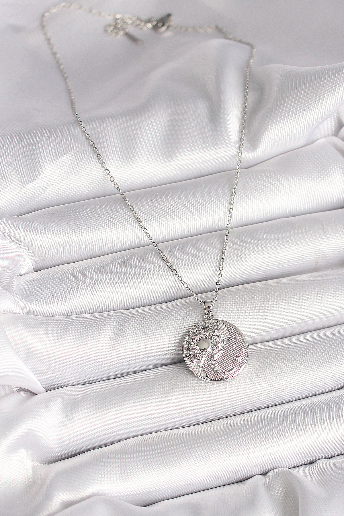 Tegan 316L Çelik Gümüş Renk Zincir Zirkon Taşlı Ay Güneş İşlemeli Madalyon Model Kadın Kolye TG27BKO9959