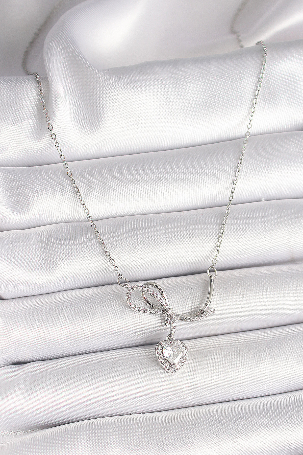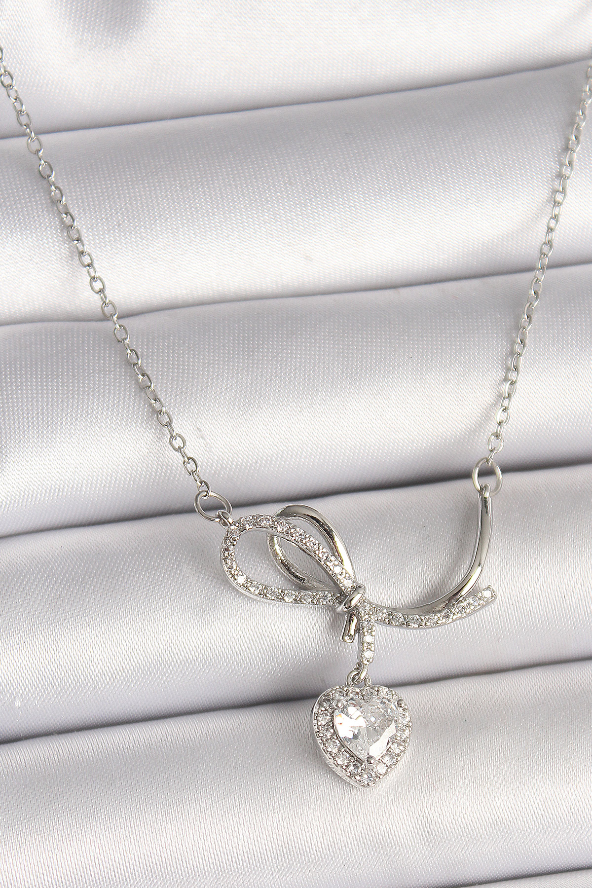 Tegan 316L Çelik Gümüş Renk Zincir Zirkon Taşlı Düğüm Sallantı Kalp Figür Kadın Kolye TG27BKO9856