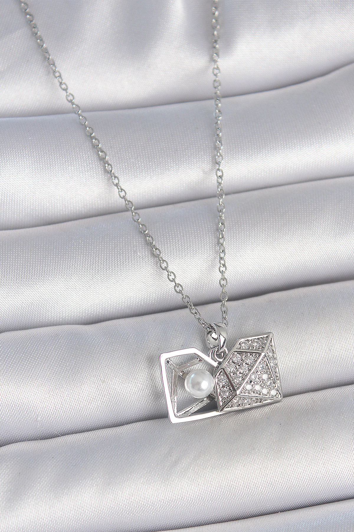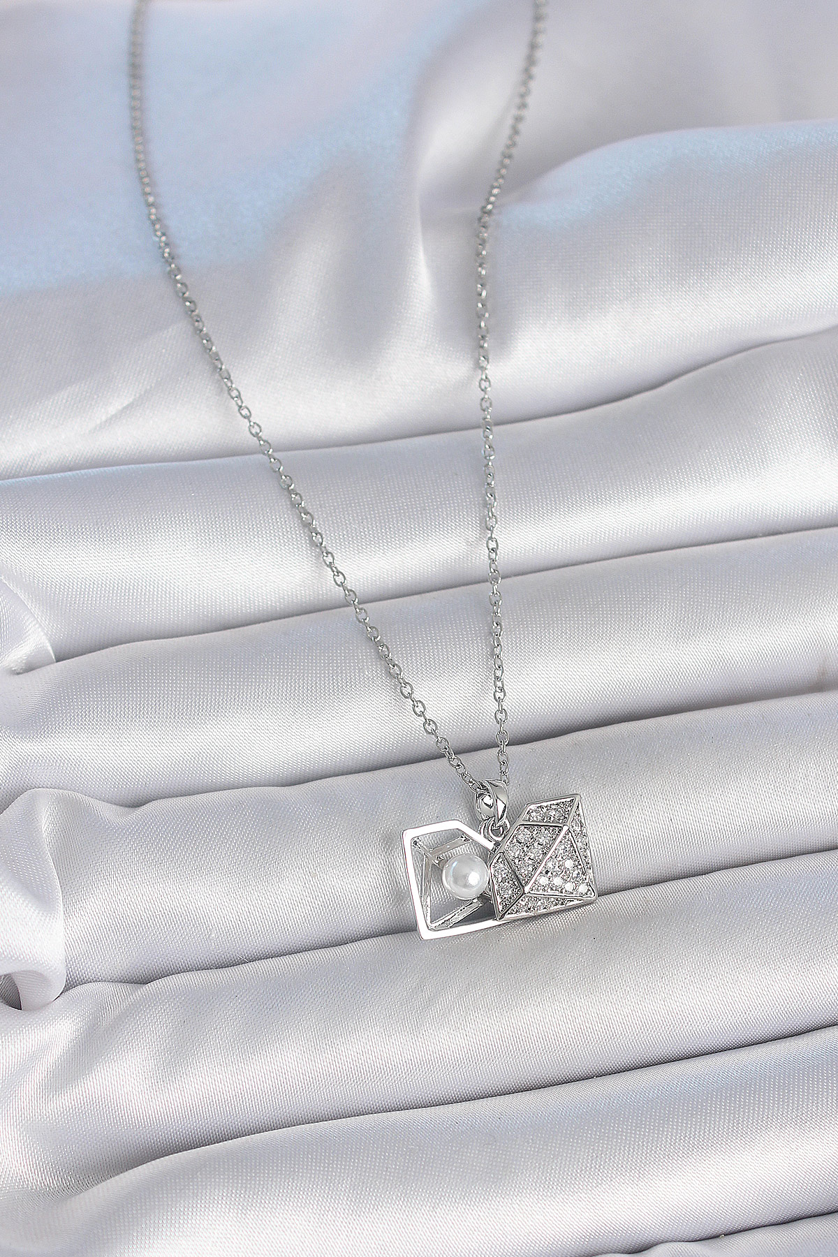 Tegan 316L Çelik Gümüş Renk Zincir Zirkon Taşlı İncili Açılır Elmas Model Kadın Kolye TG27BKO10048