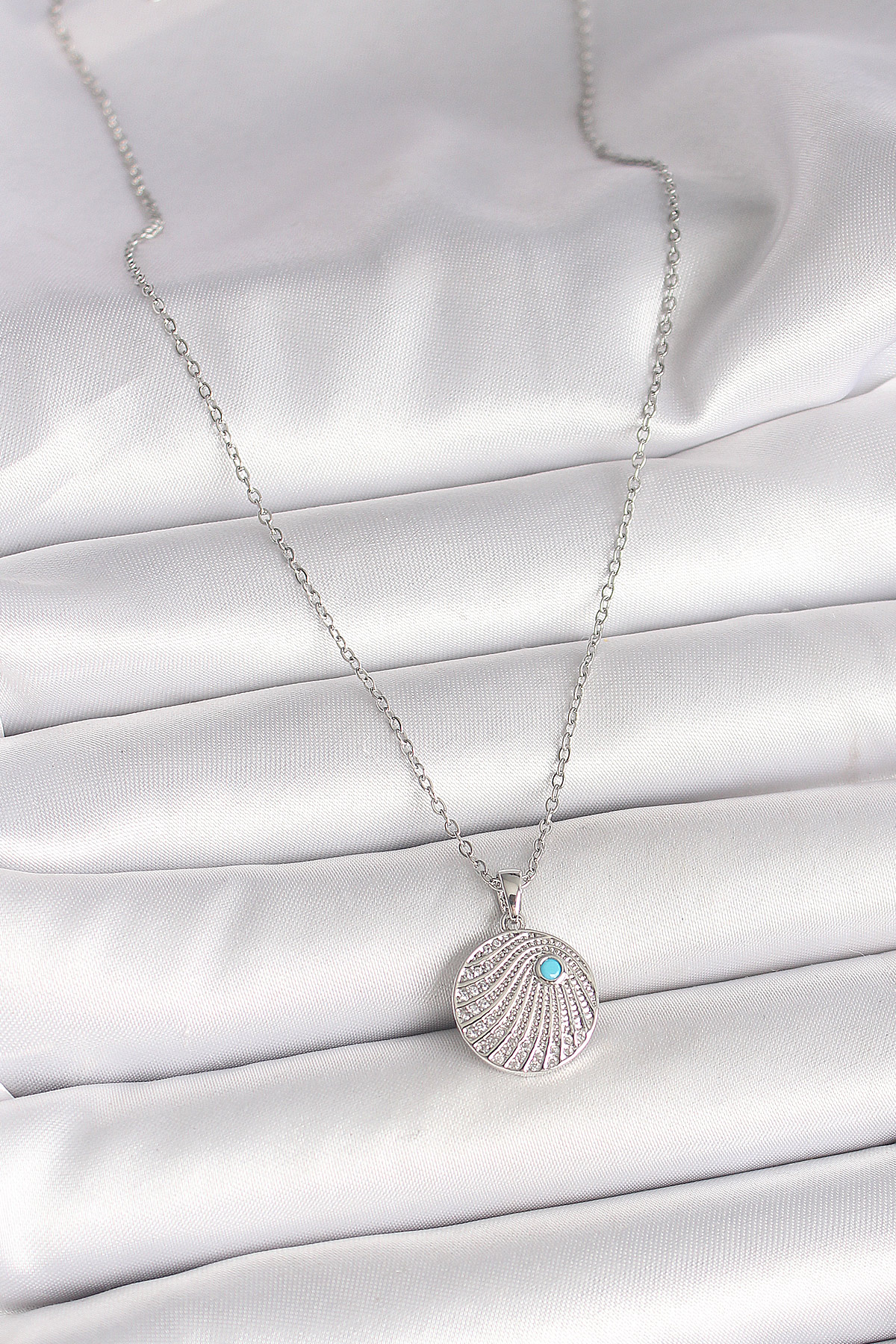Tegan 316L Çelik Gümüş Renk Zincir Zirkon Taşlı Mavi Taş Detaylı Madalyon Model Kadın Kolye TG27BKO9965