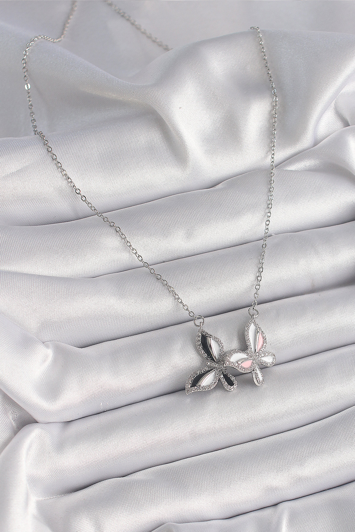 Tegan 316L Çelik Gümüş Renk Zincir Zirkon Taşlı Renkli Kelebek Model Kadın Kolye TG27BKO9615