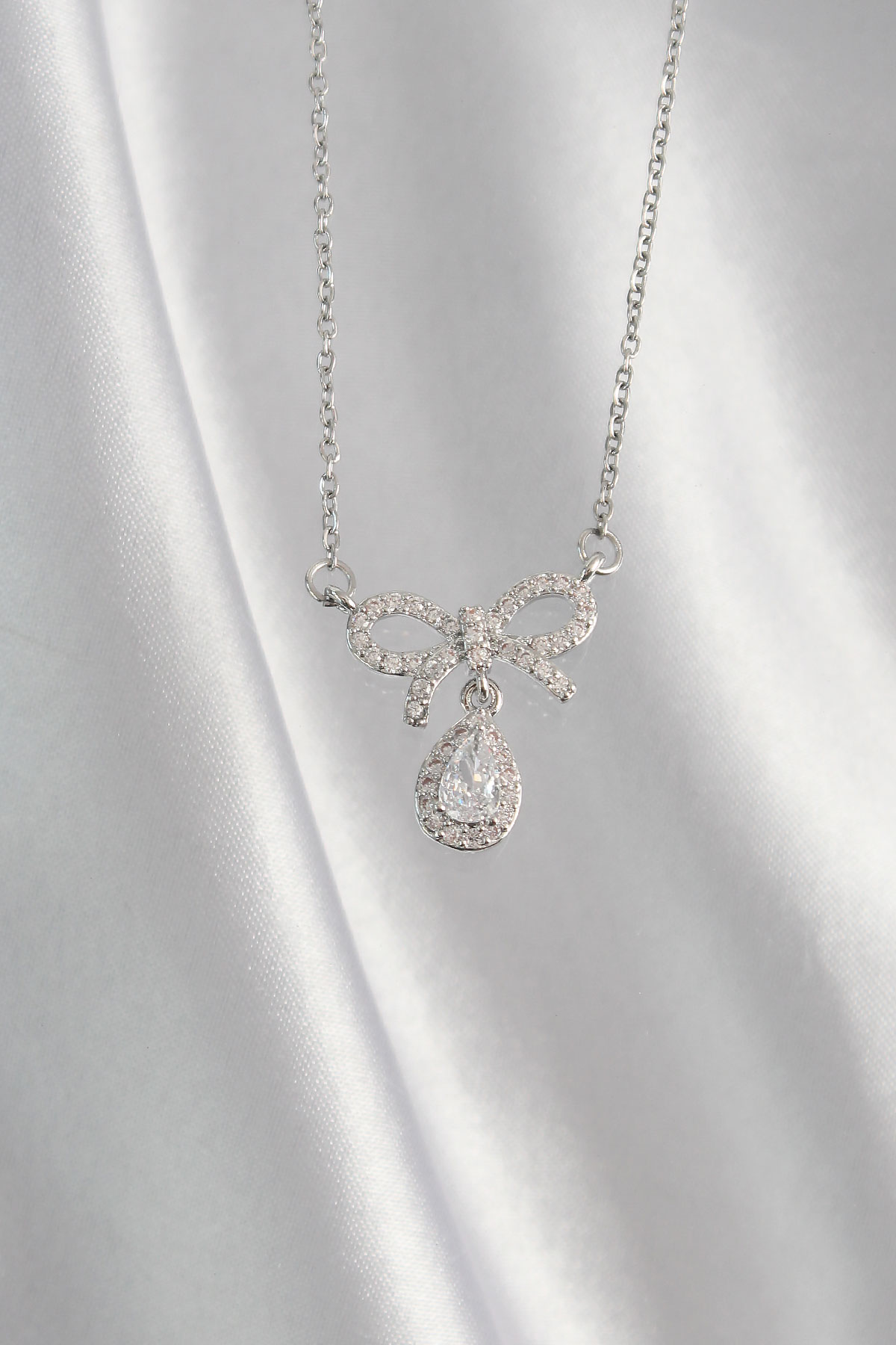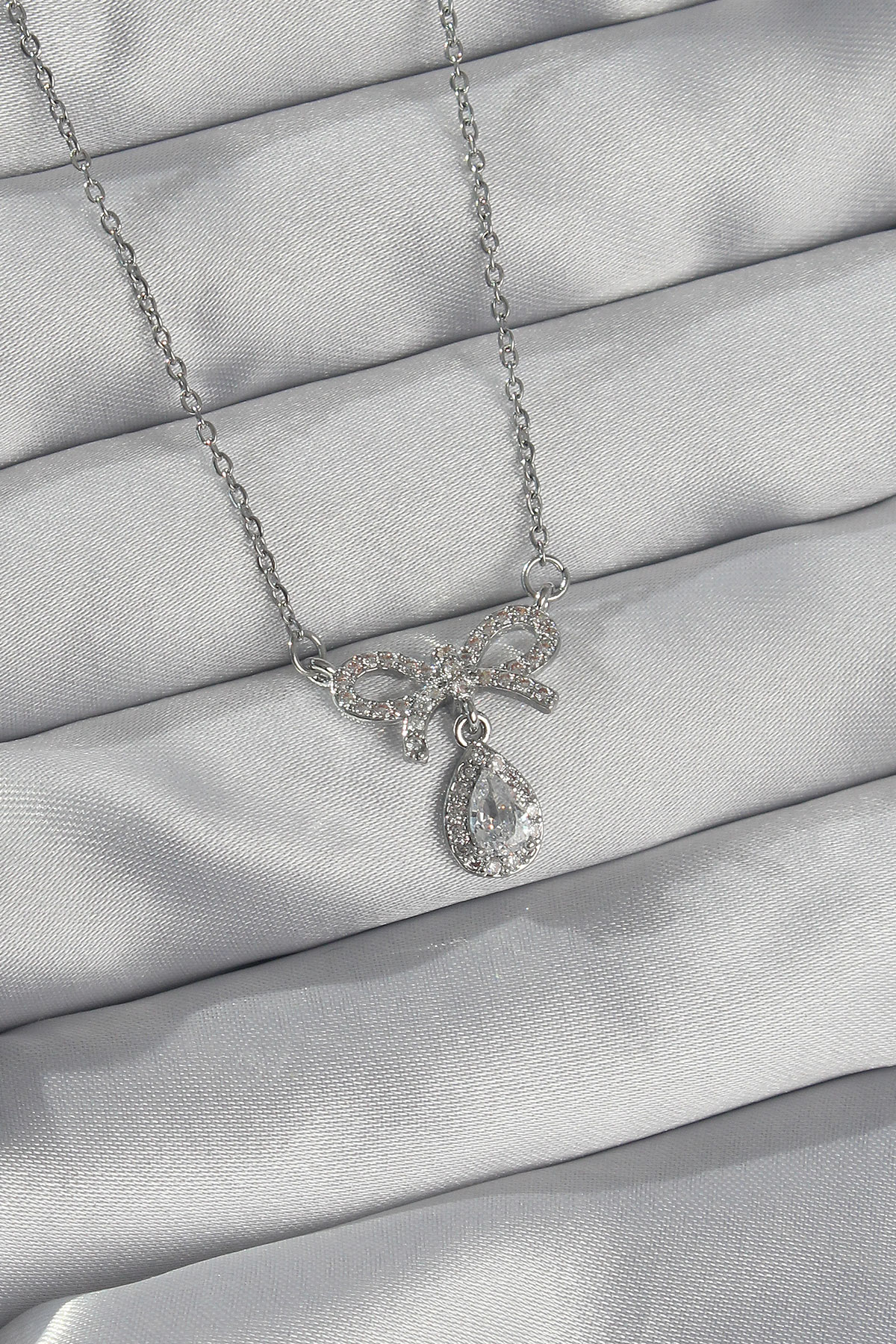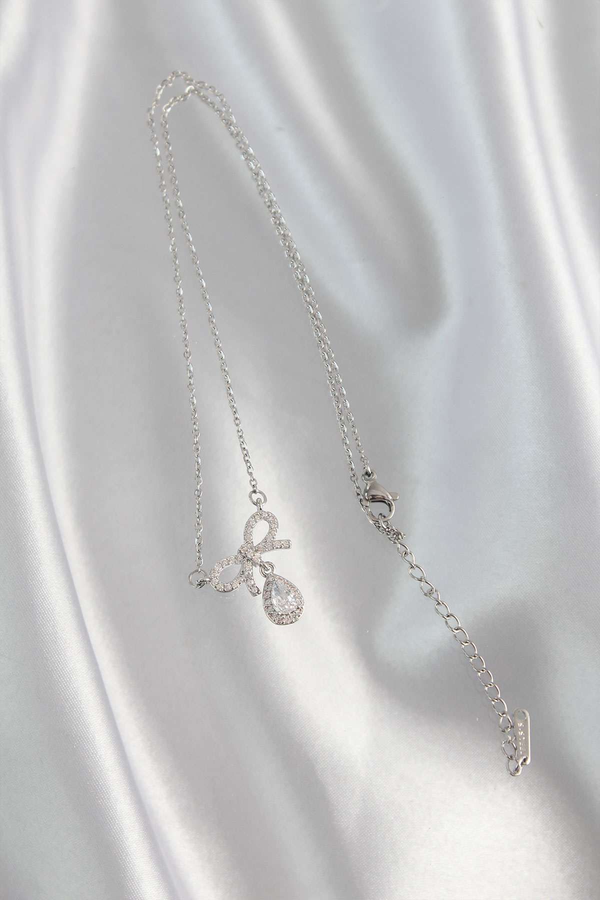 316L Çelik Gümüş Renk Fiyonk Detay Pembe Zirkon Taşlı Tektaş Kolye