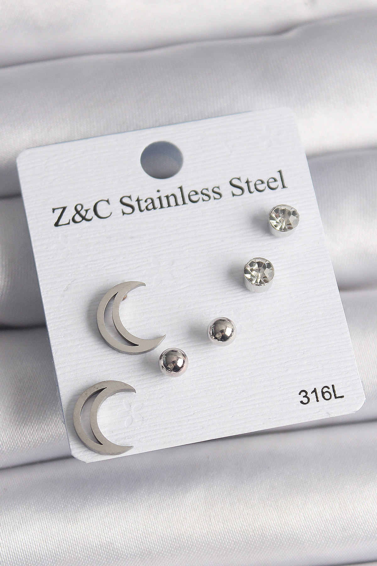 Tegan 316L Çelik Gümüş Renk Zirkon Taşlı Hilal Model Kadın Küpe Seti TG27BKP10010