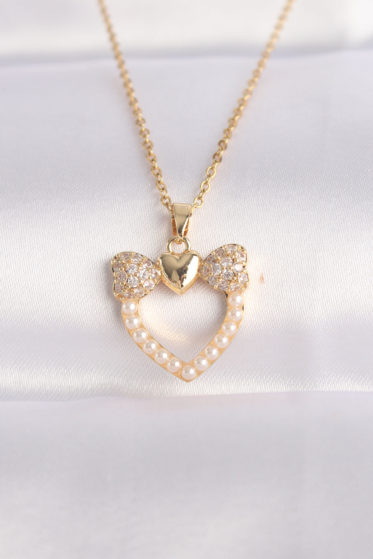 Tegan 316L Çelik Zincir Altın Renk İnci Taş Detay Zirkon Taşlı Kalp Kolye TG27BKO8630