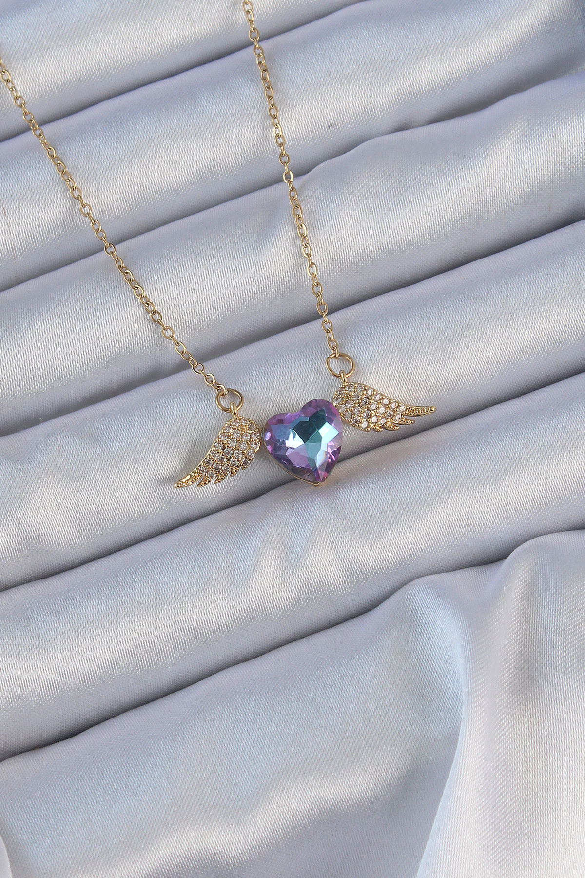 Tegan 316L Çelik Zincir Altın Renk Mavi Mor Zirkon Taşlı Kanatlı Kalp Kolye TG27BKO9161