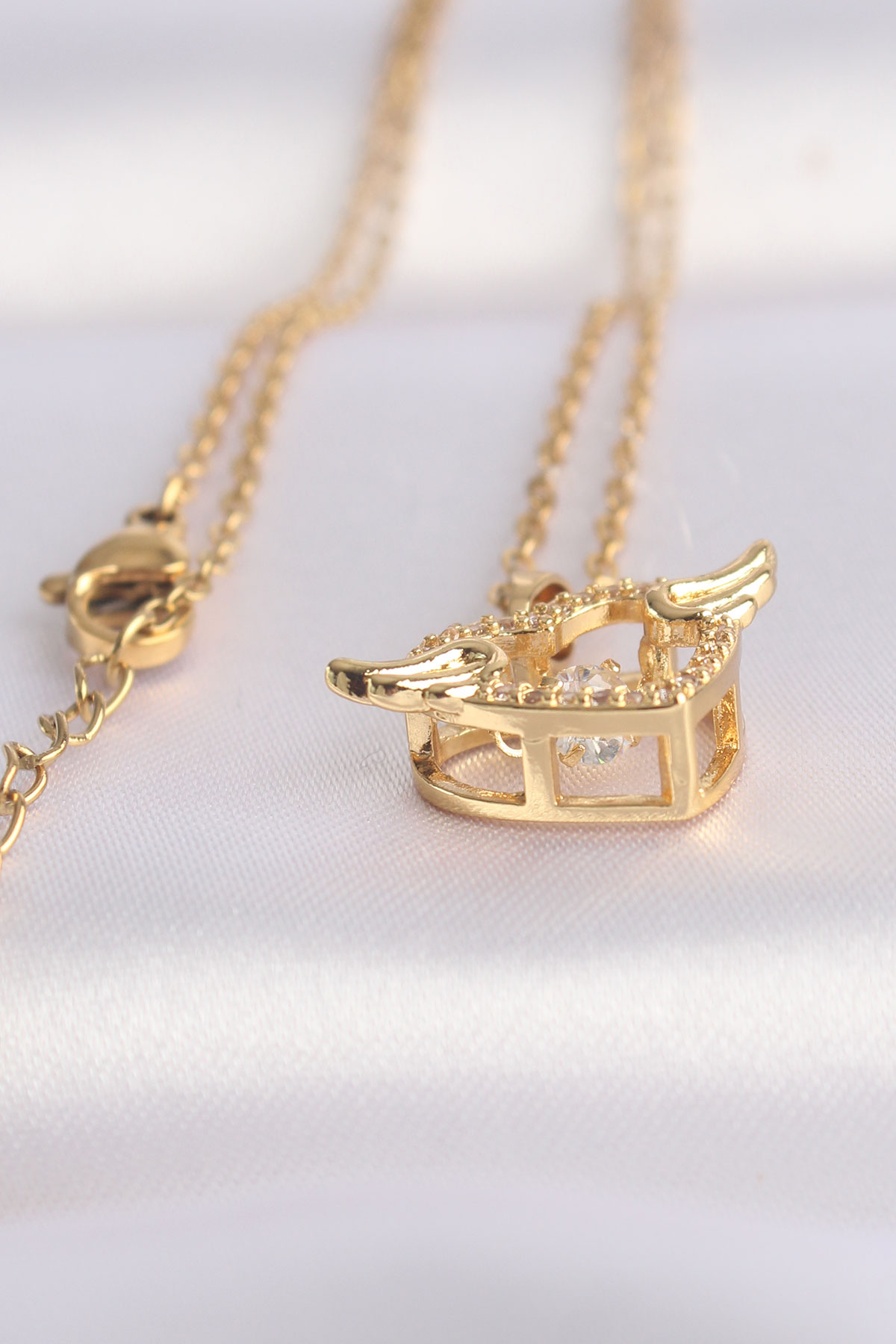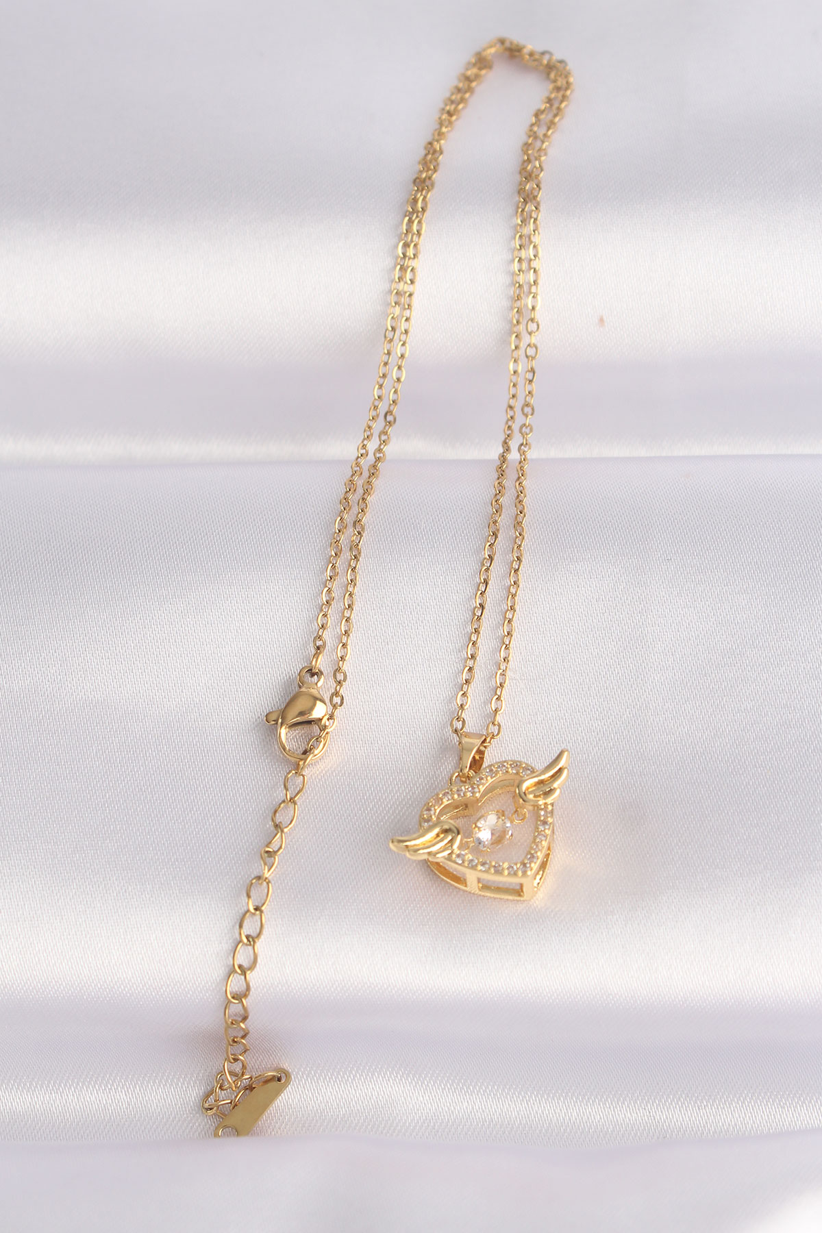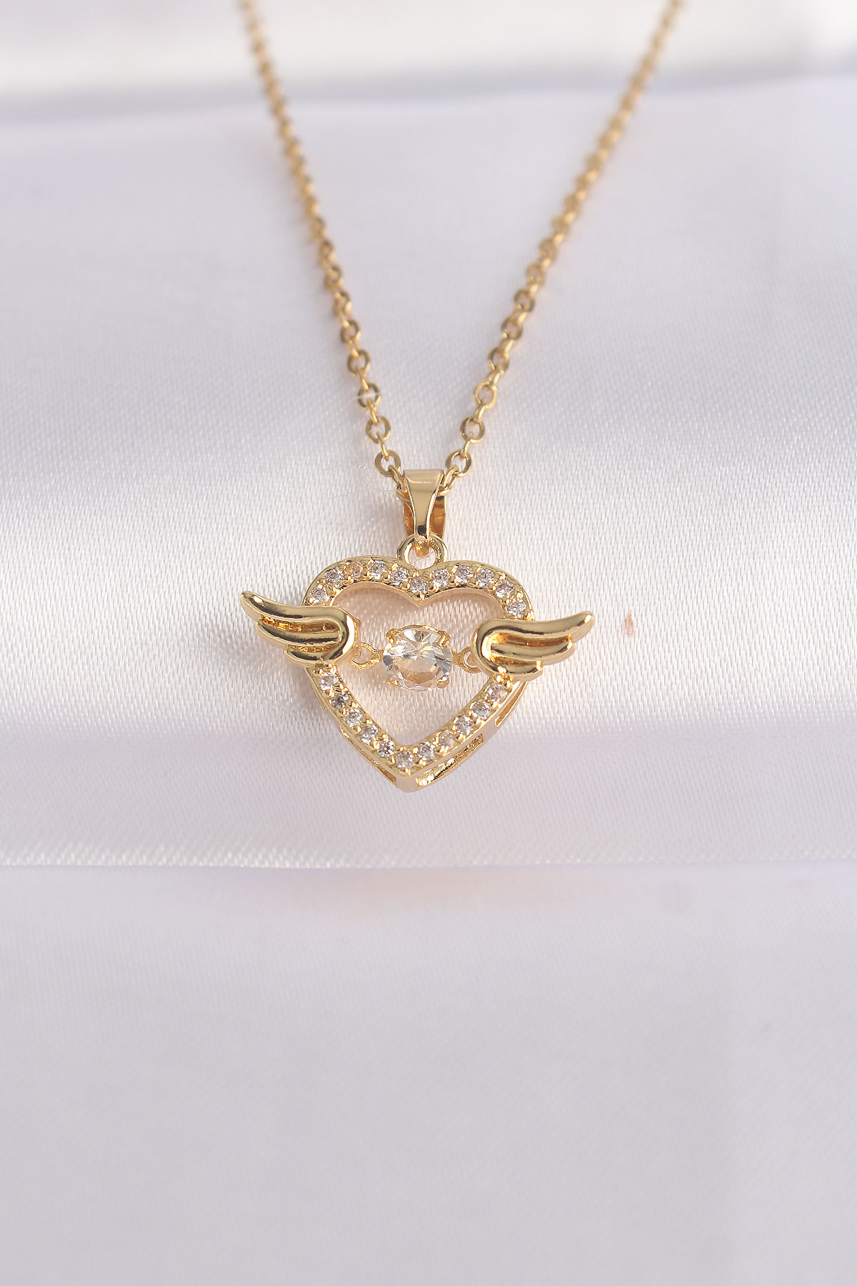 Tegan 316L Çelik Zincir Altın Renk Zirkon Taşlı Kanatlı Kalp Kolye TG27BKO8628