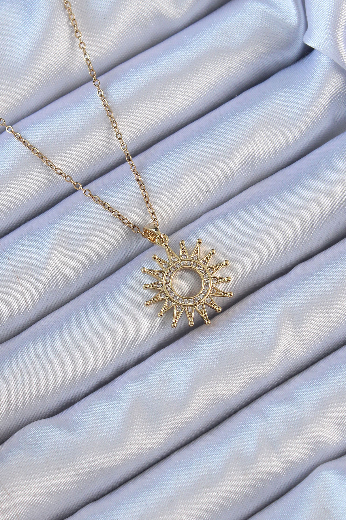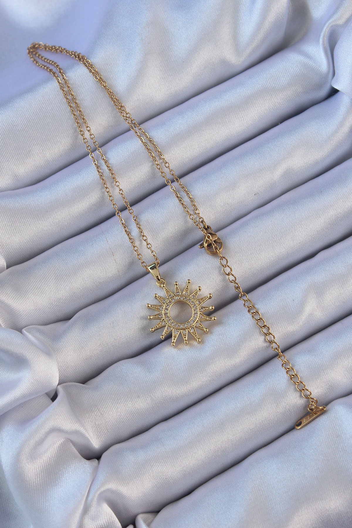 Tegan 316L Çelik Zincir Altın Renk Zirkon Taşlı Parlayan Güneş Kolye TG27BKO9105