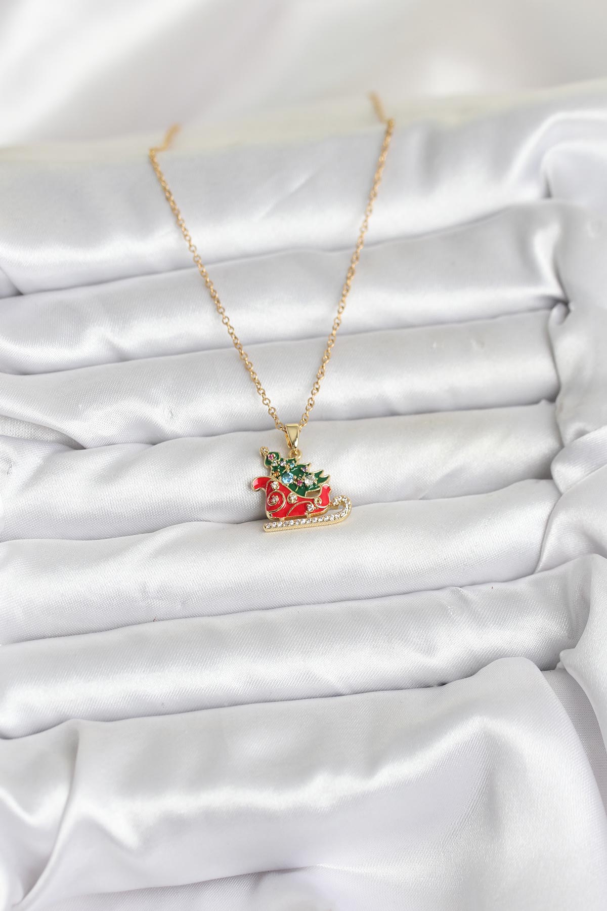 Tegan 316L Çelik Zincir Gold Renk Kızak ve Çam Ağacı Figürlü Yılbaşı Temalı Kadın Kolye TG27BKO10716