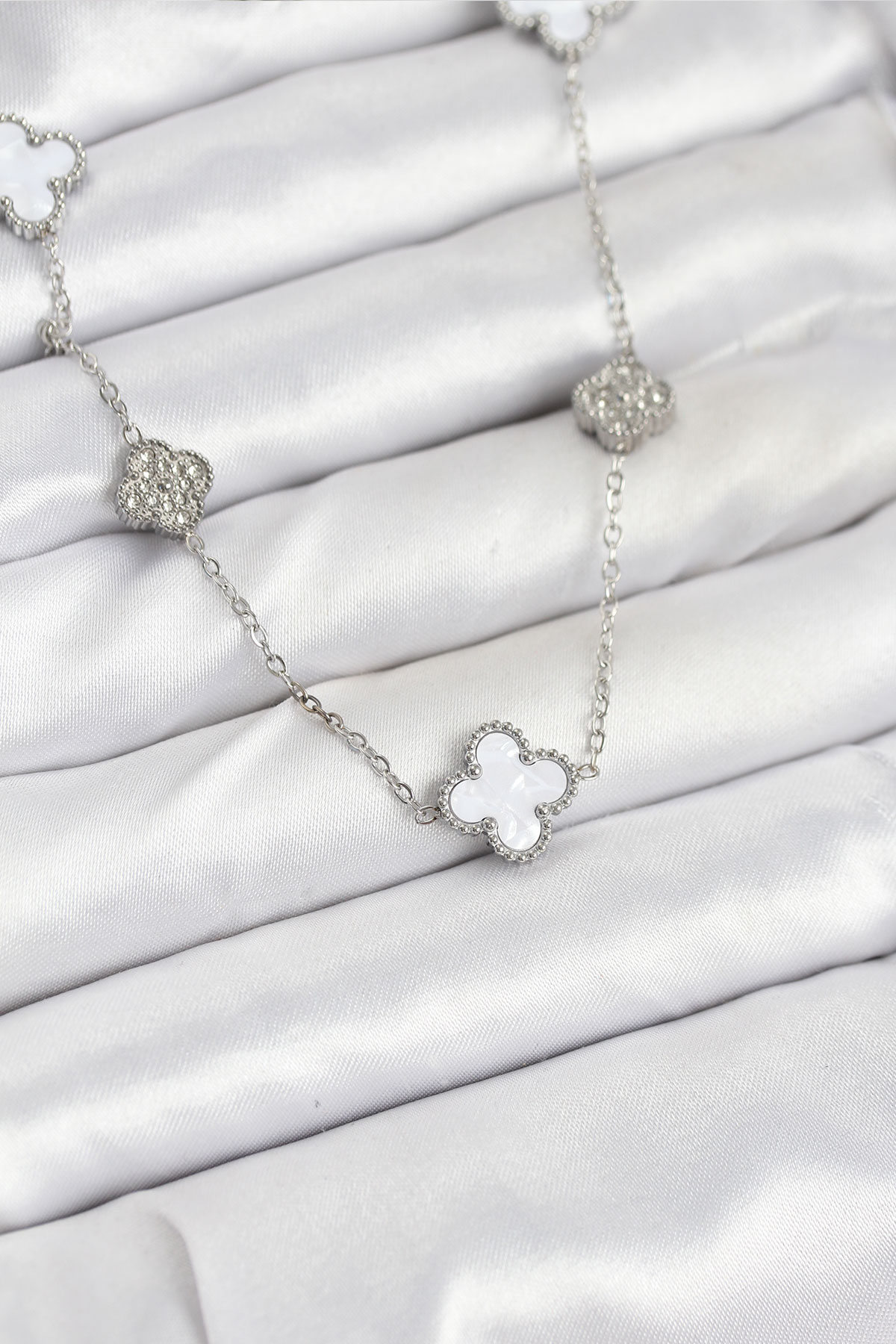 Tegan 316L Çelik Zincir Gümüş Renk Beyaz ve Zirkon Taşlı Yonca Kadın Kolye TG27BKO10588
