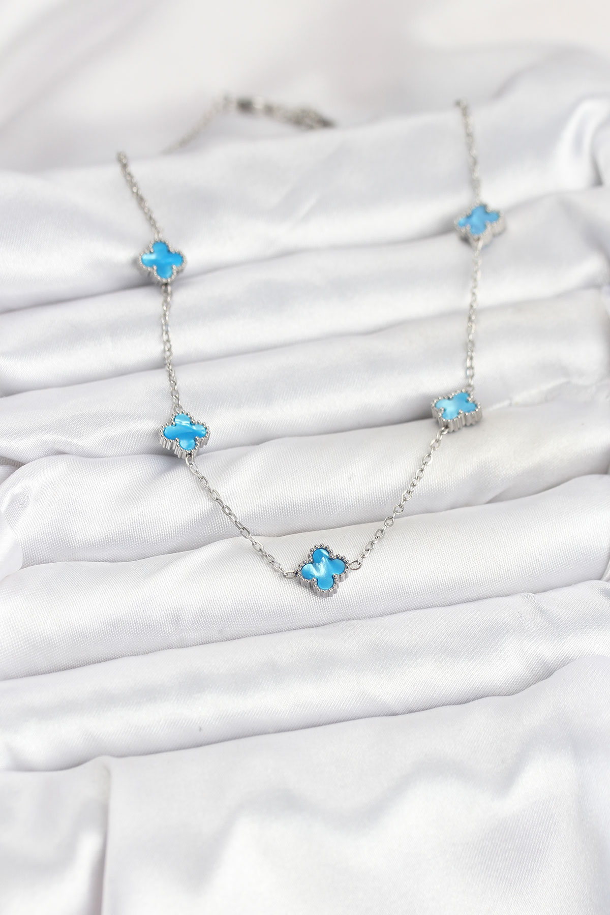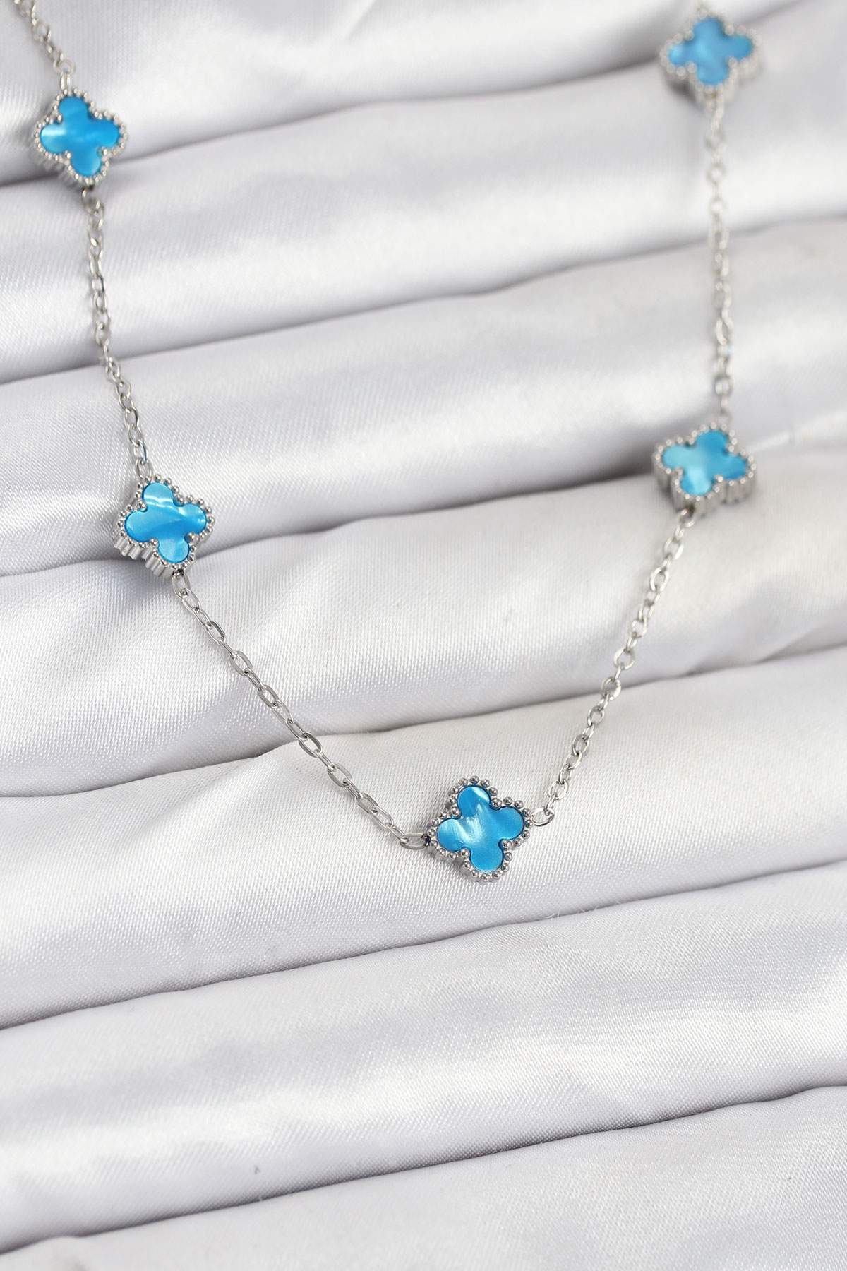 Tegan 316L Çelik Zincir Gümüş Renk Buz Mavisi Baby Boy Yonca Kadın Kolye TG27BKO10576