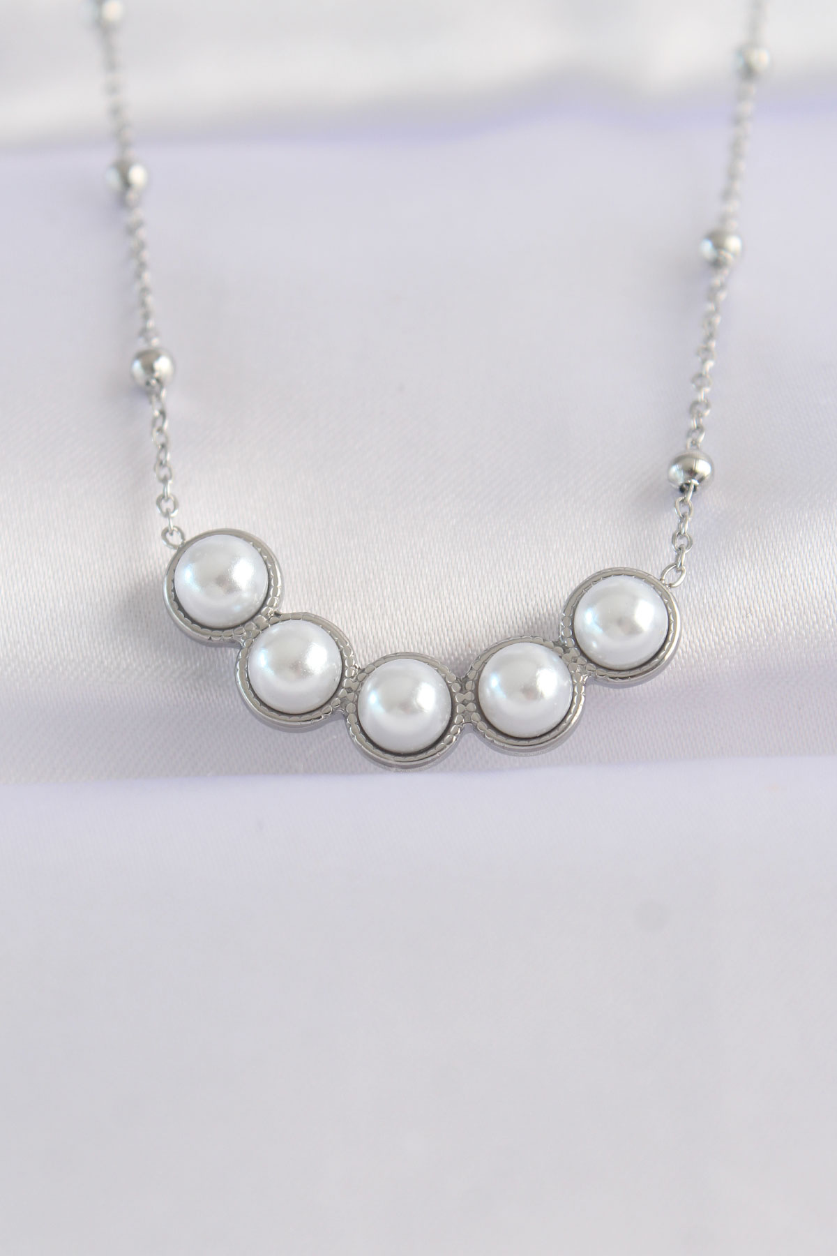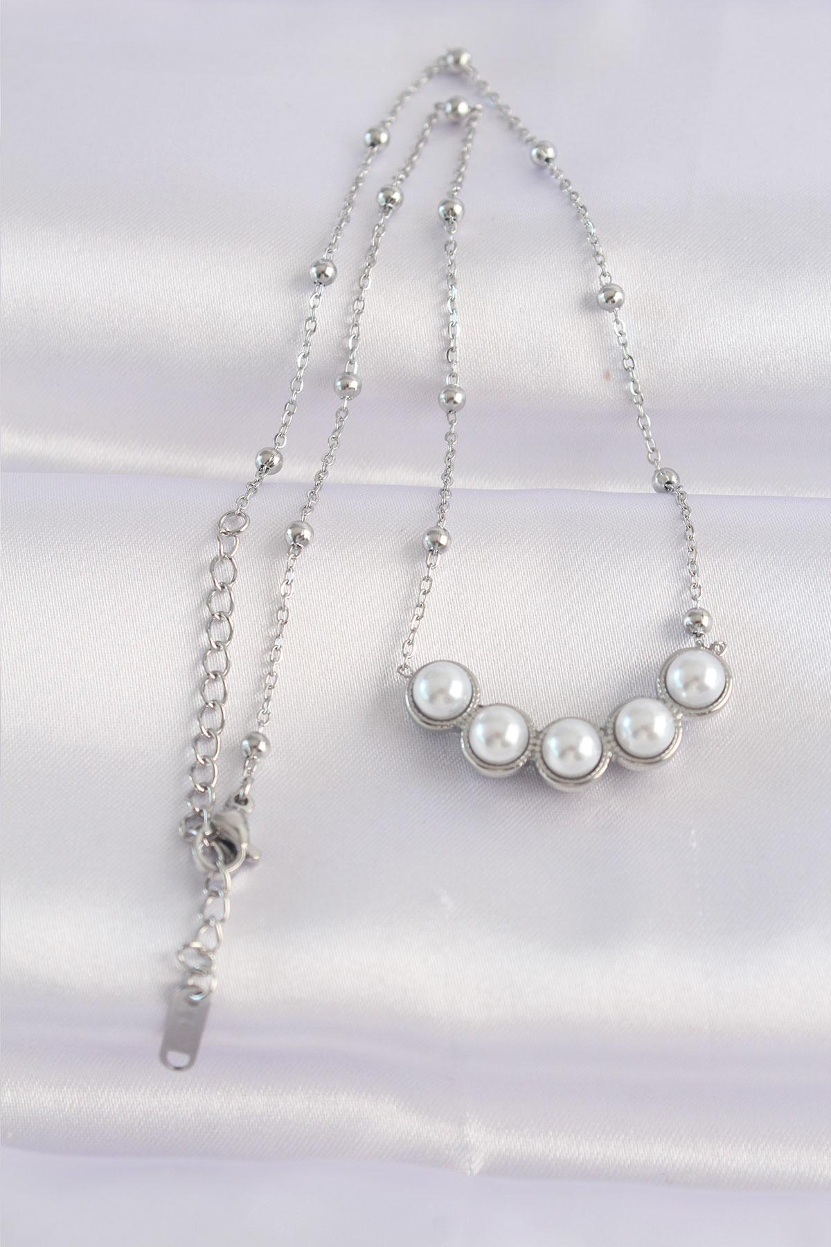 Tegan 316L Çelik Zincir Gümüş Renk Sıralı İnci Taşlı Kolye TG27BKO8654