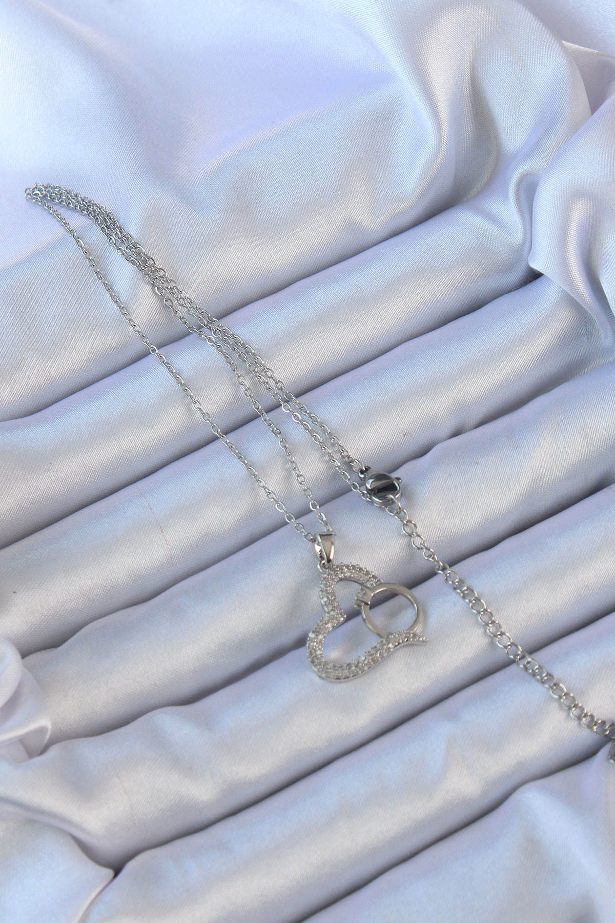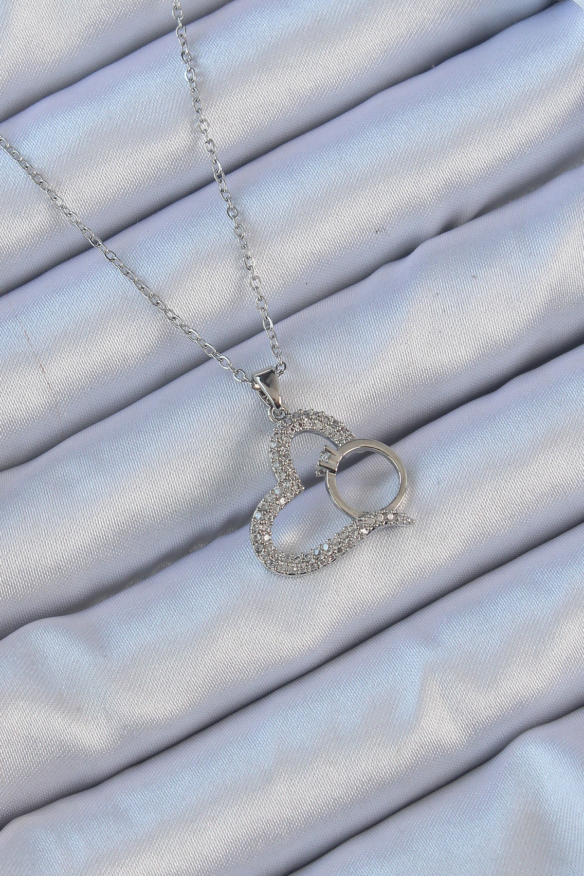 Tegan 316L Çelik Zincir Gümüş Renk Zirkon Taşlı Yüzüklü Kalp Kolye TG27BKO9146