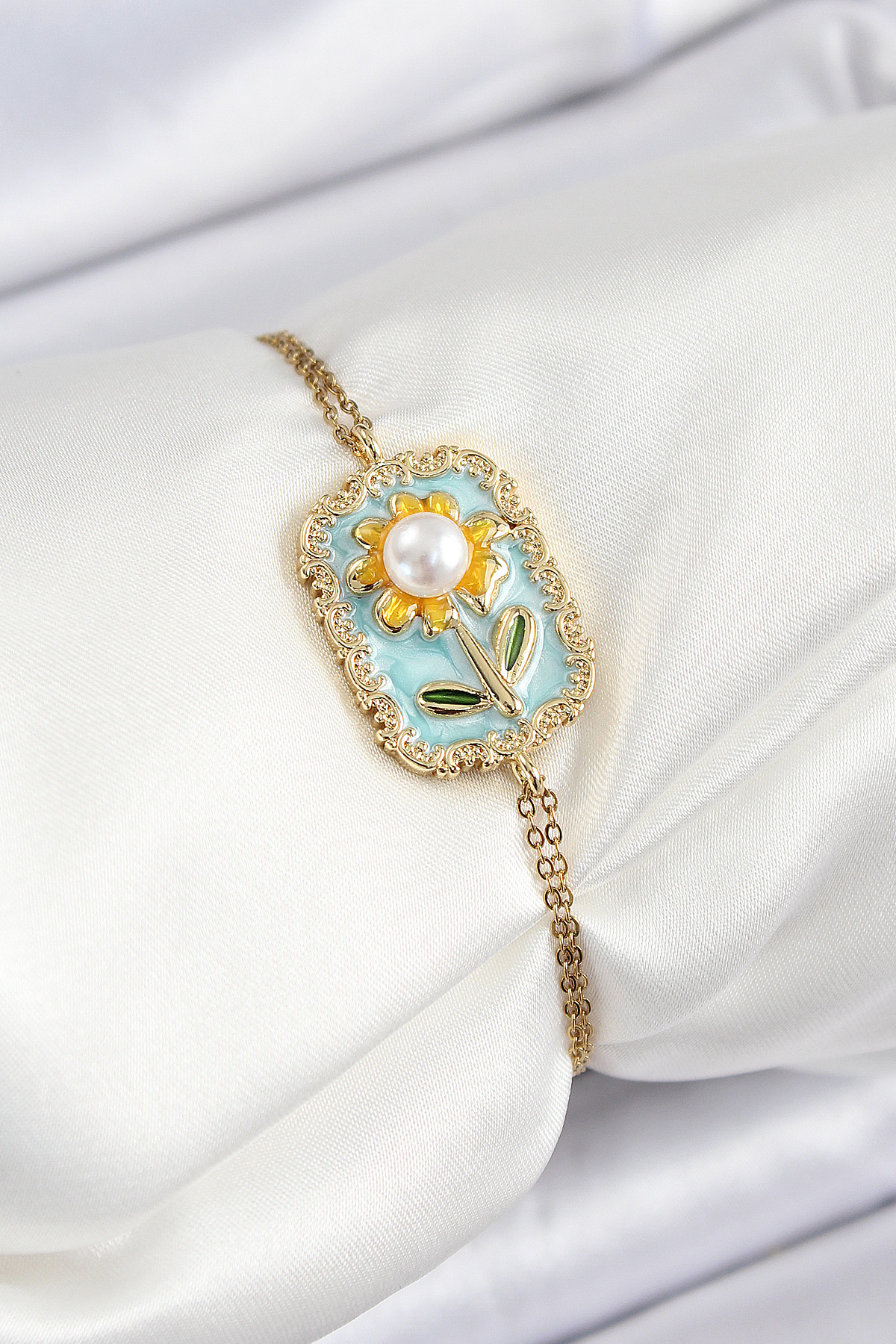 Tegan 316L Çelik Zincir Turkuaz Mineli Sanatsal Portre İnci Detaylı Papatya Model Gold Renk Kadın Bileklik TG27BB7230