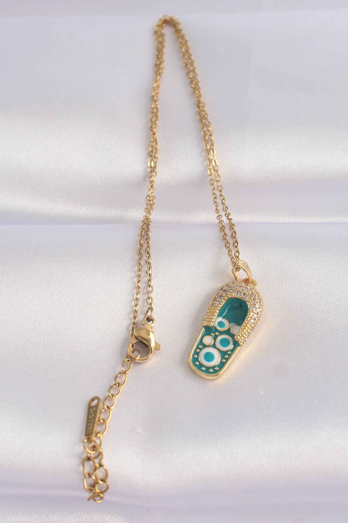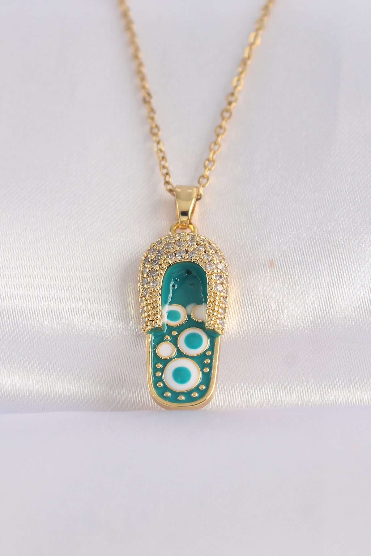 Tegan 316L Çelik Zincir Zirkon Taşlı Altın Renk Nazarlı Terlik Tasarımlı Kolye TG27BKO8664