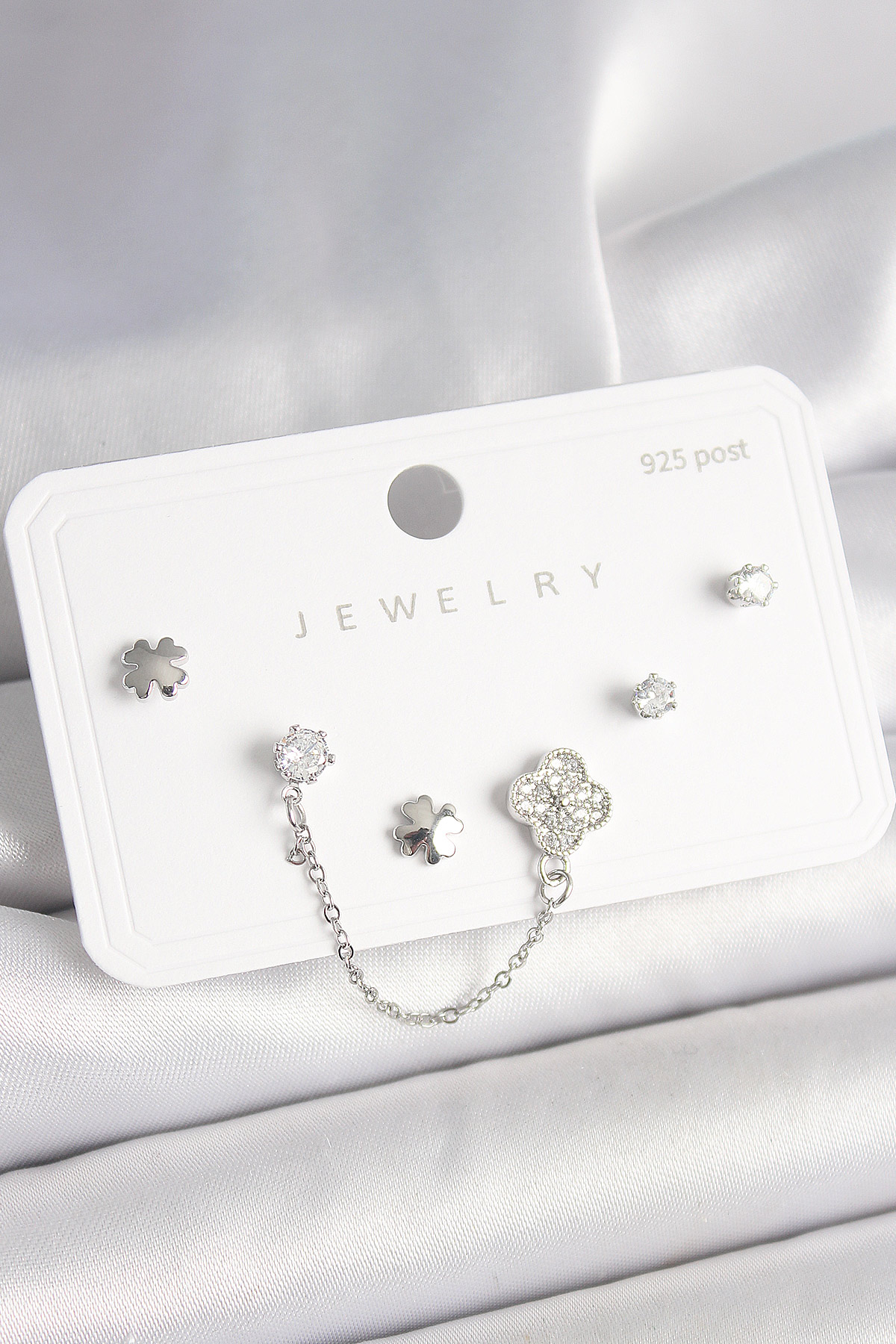 Tegan 925 Ayar Gümüş Çivi Pirinç Gümüş Renk Zirkon Taşlı Yonca Model Sallantı Zincir Detay Kadın Küpe Seti TG27BKP10400