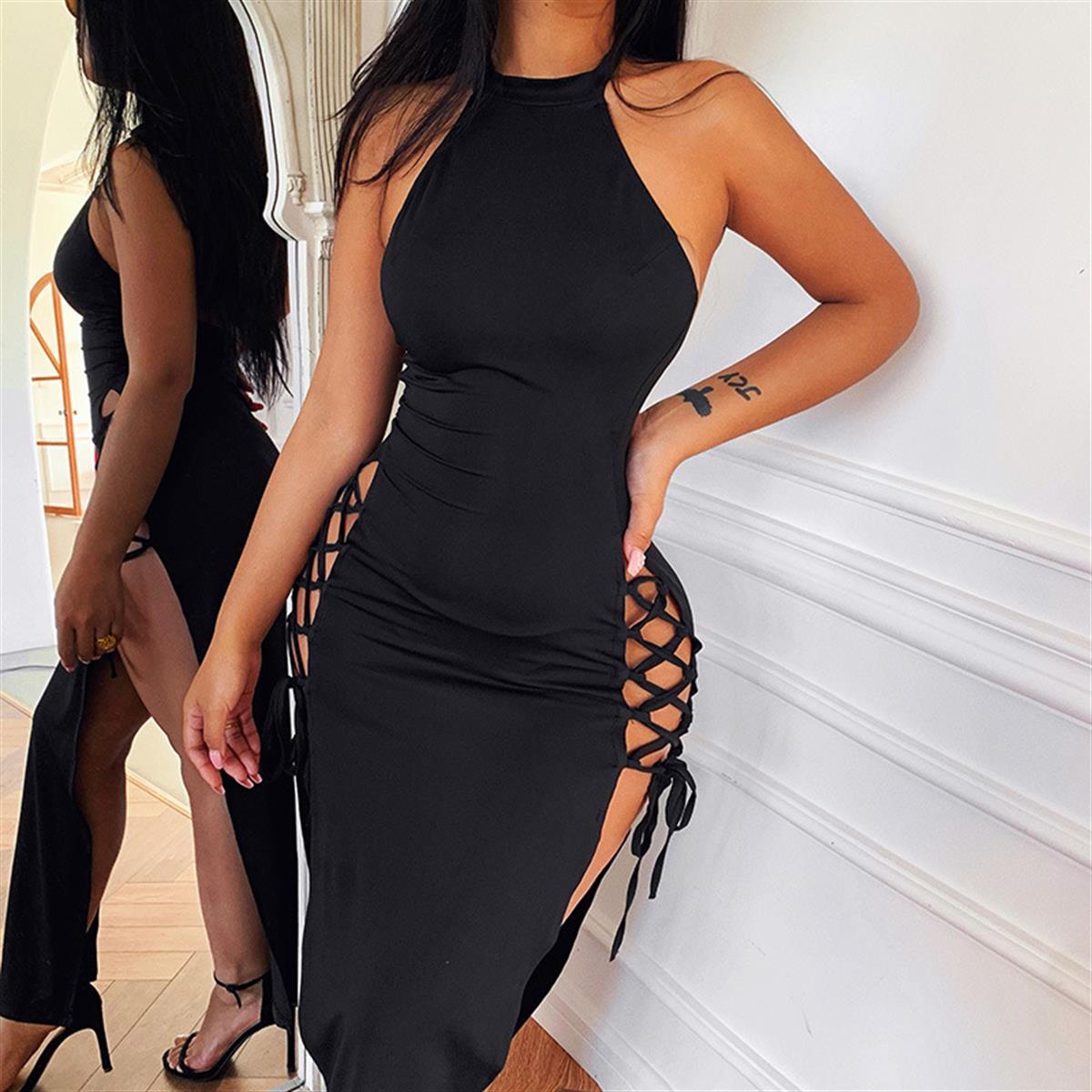 Tegan Bayan Yandan Bağlı Yırtmaçlı Siyah Elbise