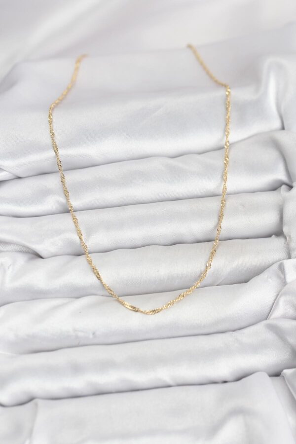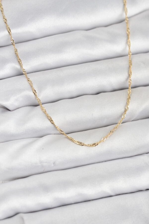 -Uzunluk: 45 cm uzunluğundadır-Materyal: Dayanıklı pirinç materyal üzerine 1. Sınıf 14K Gold (Altın) Rengi Kaplama uygulanmıştır.-Dayanıklılık: Doğru ve özenli kullanımda kararma ve renk solmasına karşı dirençlidir.-Kullanım Önerisi: Ürününüzün ışıltısını ve kaplama kalitesini uzun yıllar koruyabilmesi için parfüm, su, deterjan ve kimyasal maddelerle doğrudan temasından kaçınmanızı öneririz.-Cilt Uyarısı: Her cilt yapısının metal ve kaplamalara vereceği tepki (pH değerine bağlı olarak) farklılık gösterebilir.-Sağlıklı ve mutlu günlerde kullanmanız dileğiyle.