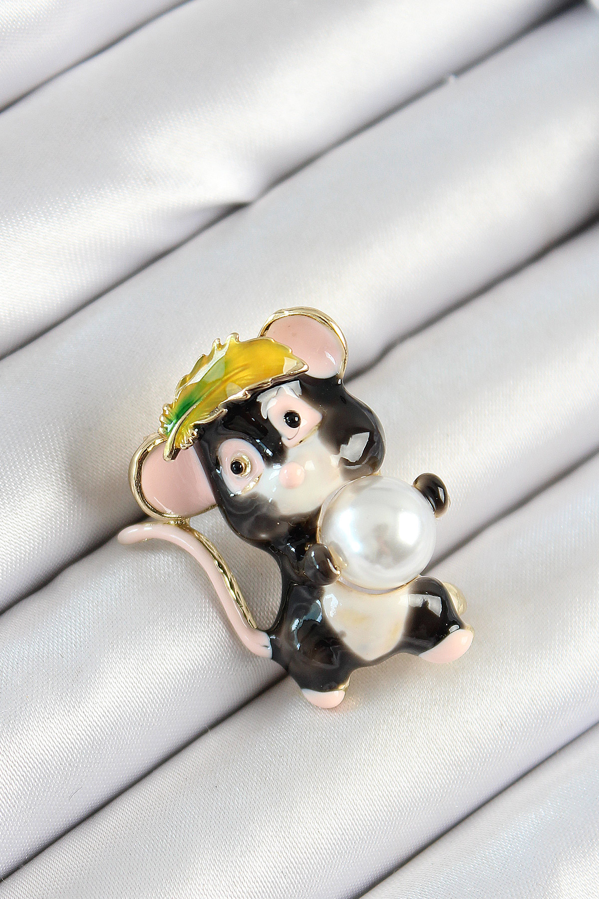 Tegan İnci Detaylı Siyah Ve Pembe 3D Sevimli Fare Figürlü Gold Renk Kadın Broş TG27BR437