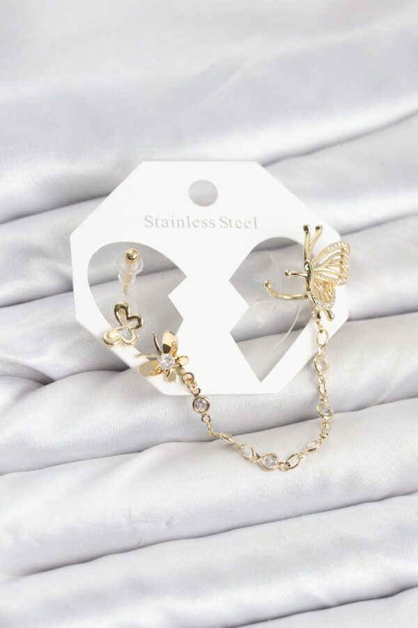 Tegan Kelebekli Model Pirinç Gold Renk Zincir Bağlantılı Ear Cuff Küpe Seti TG27BKP11544