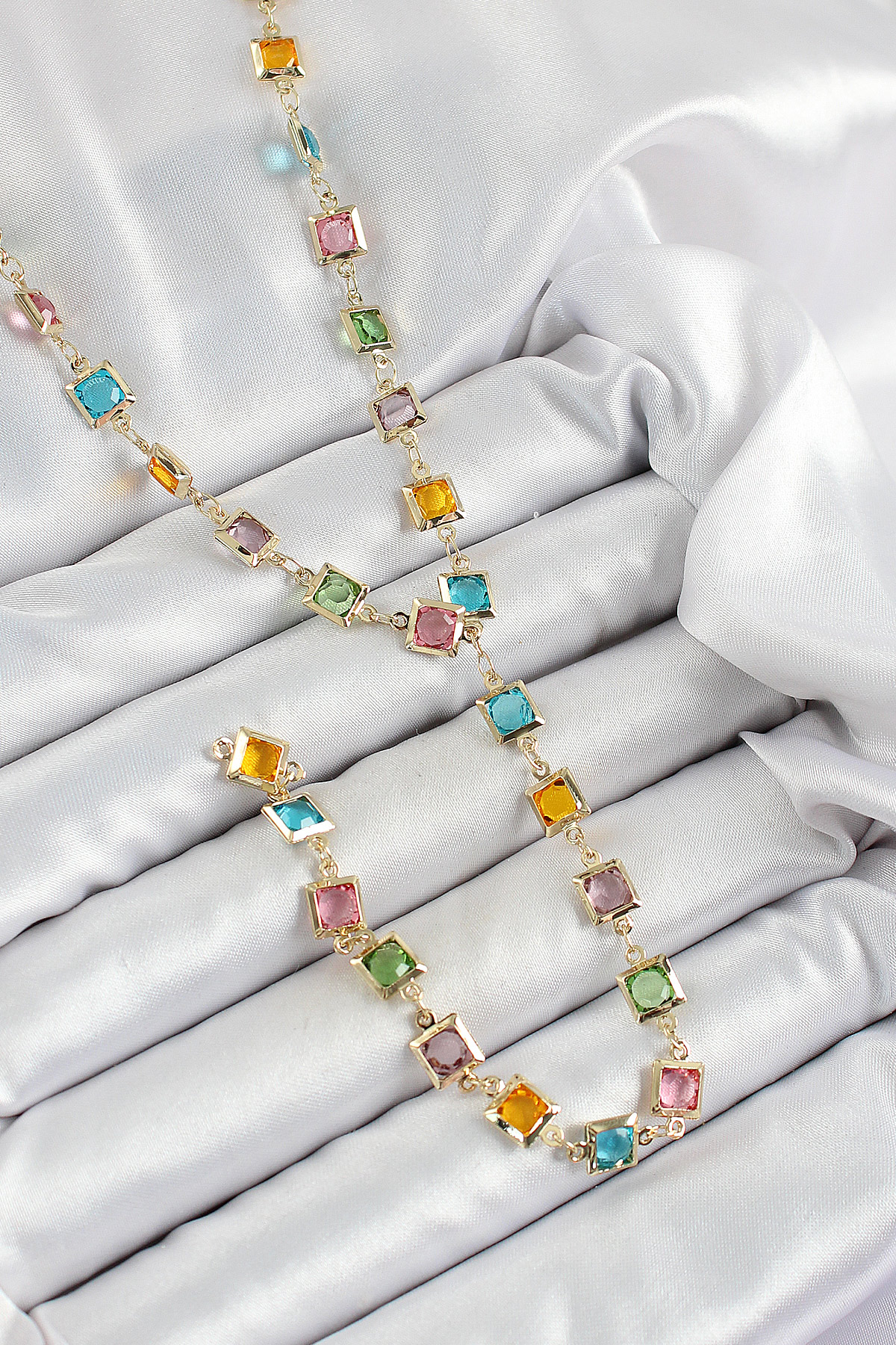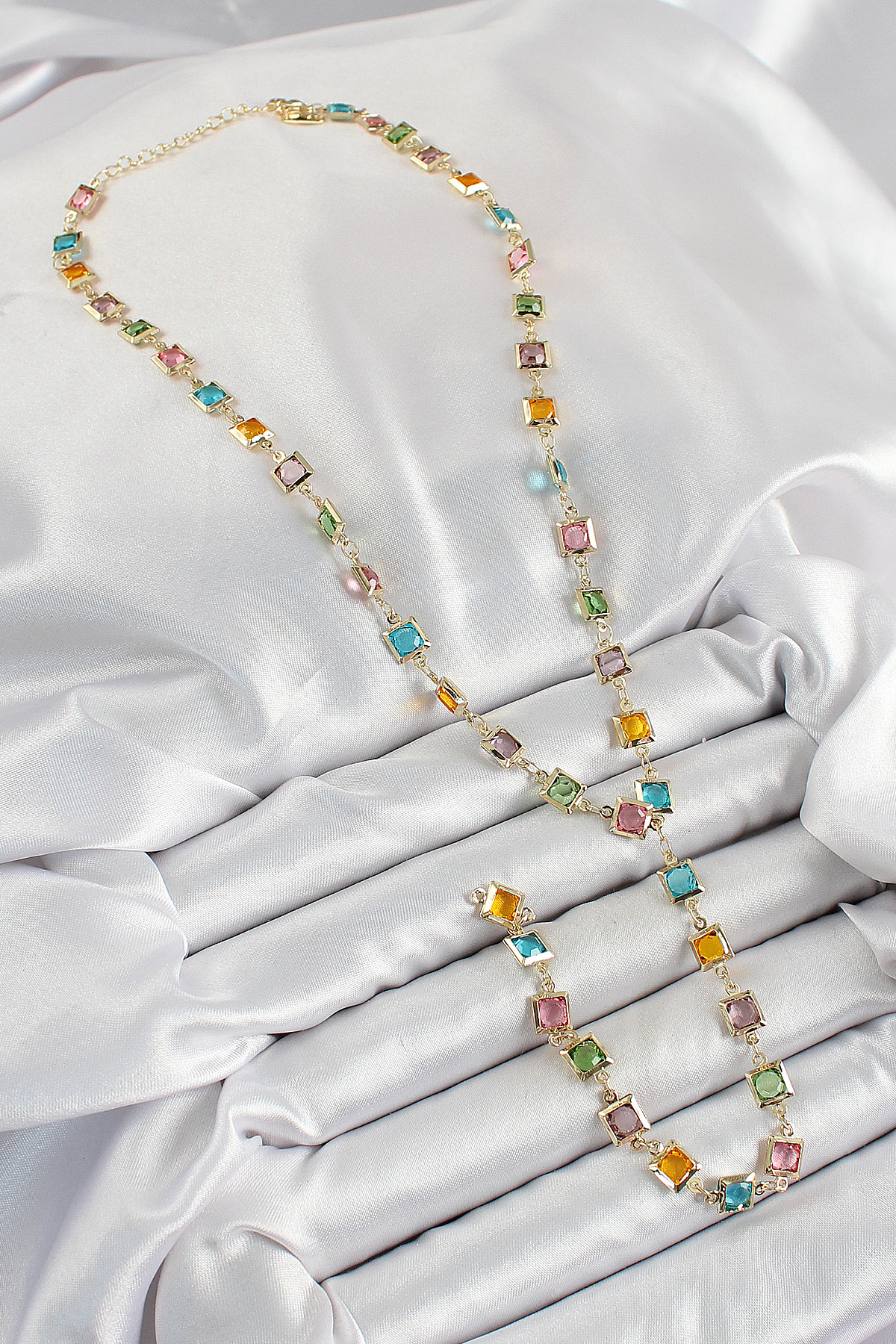 Tegan Pirinç Asorti Kare Model Gold Renk Zirkon Taşlı Y Kolye TG27BKO10253