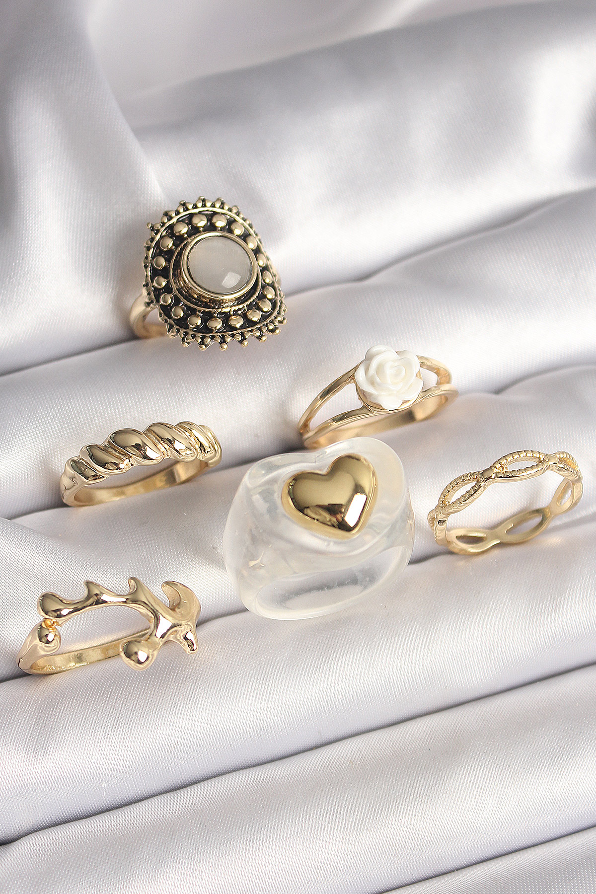 Tegan Pirinç Gold Renk Beyaz Gül Figür Kalp İşlemeli Sarmal Detay 6’Lı Kadın Yüzük Seti TG27BYK3639